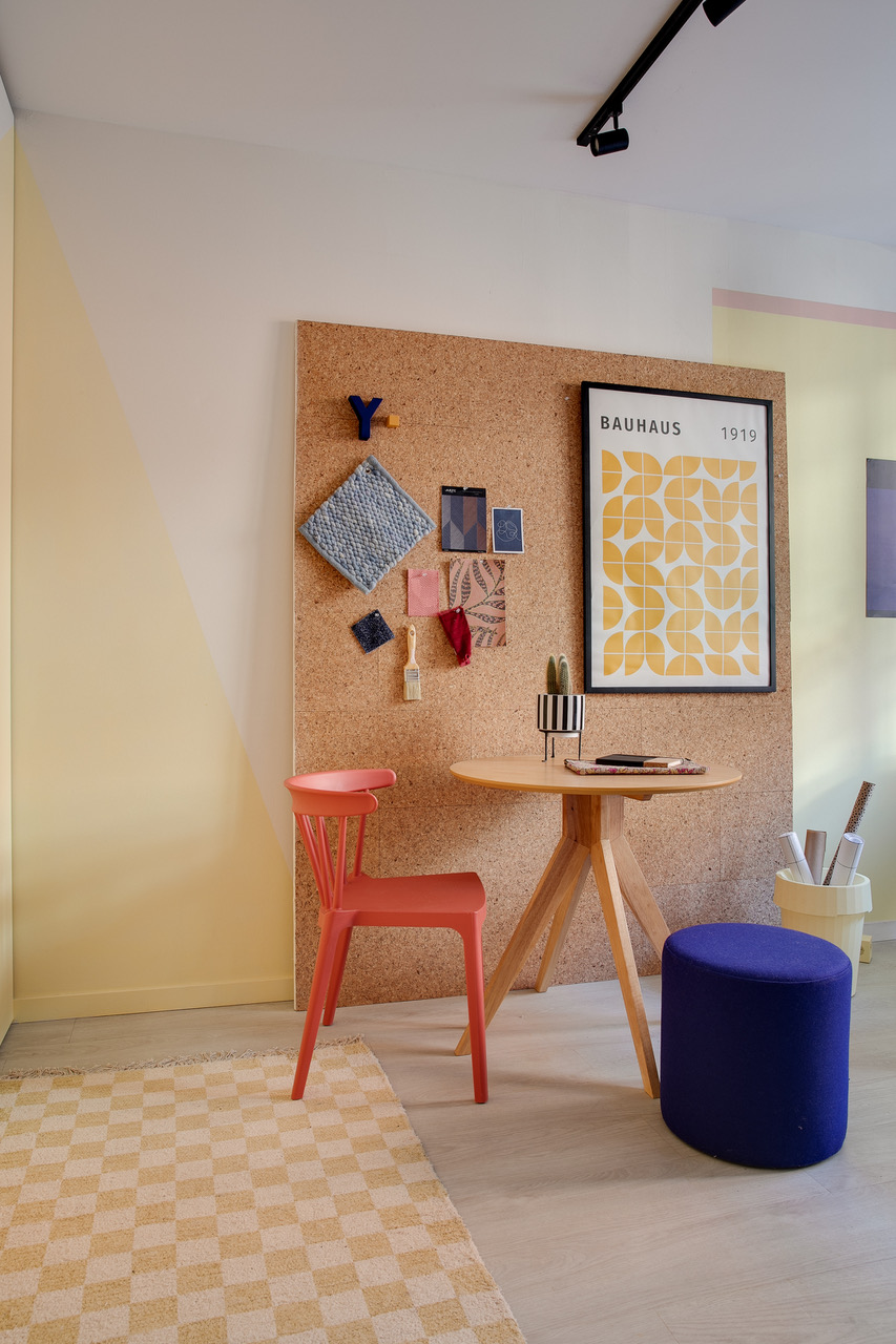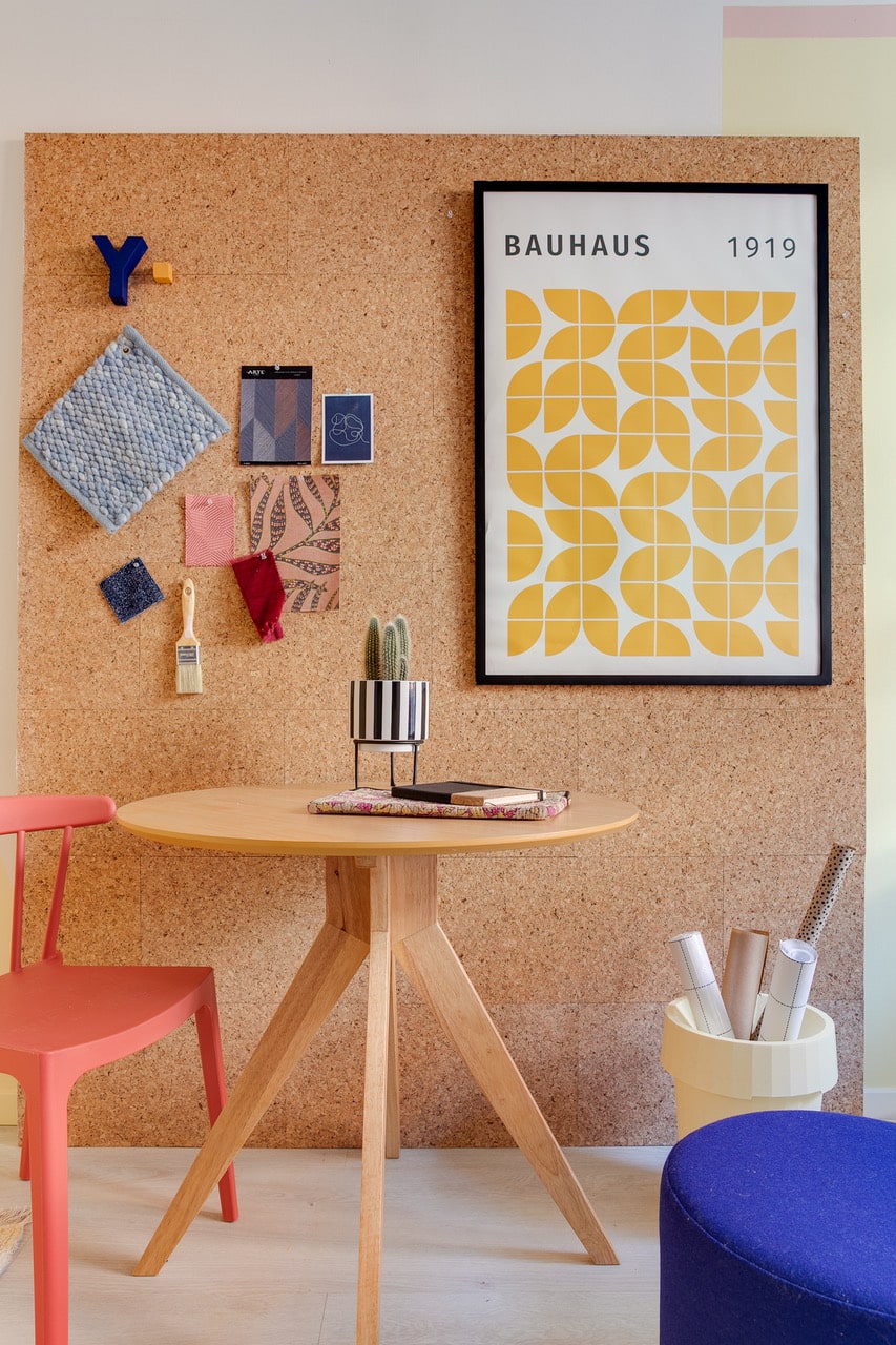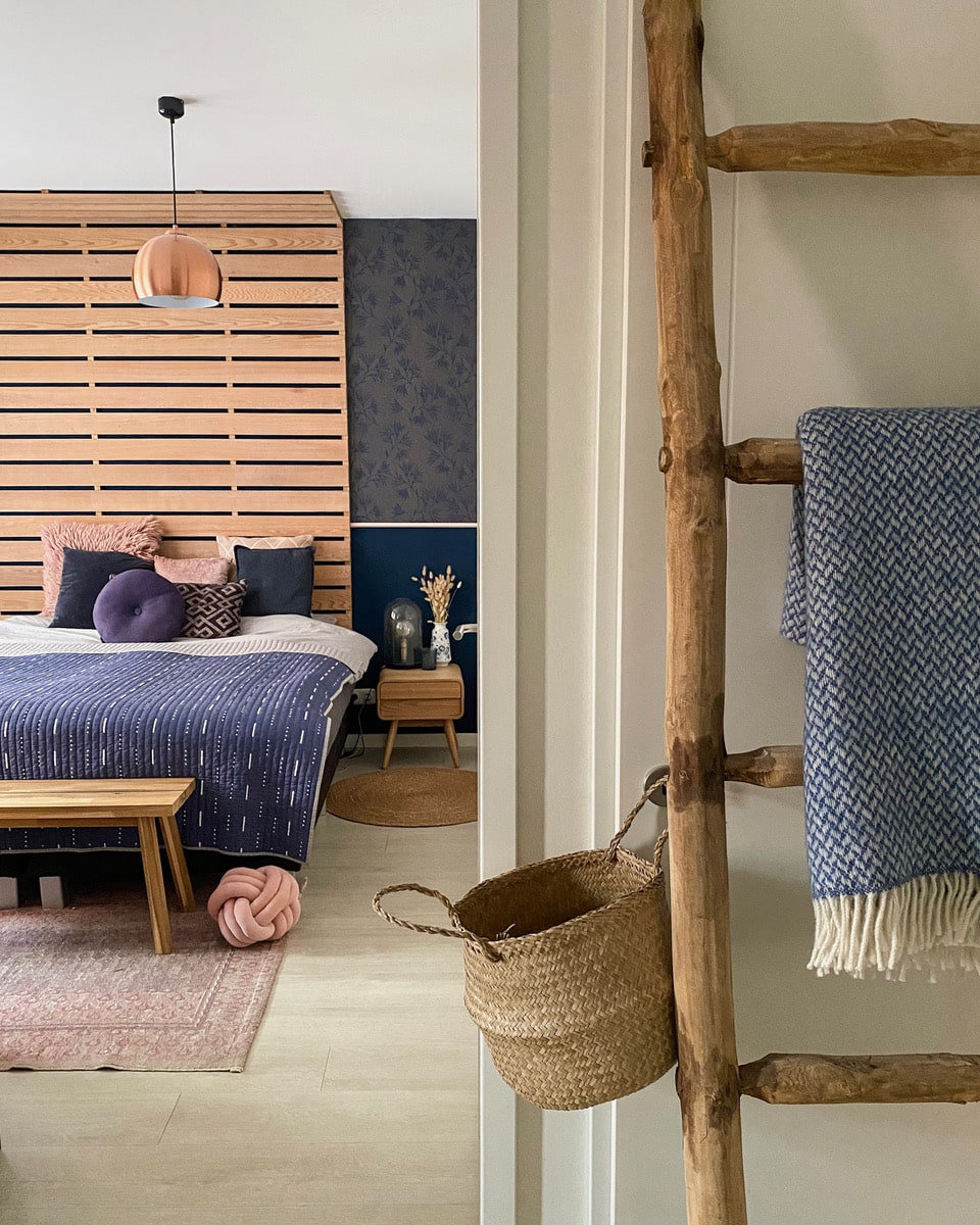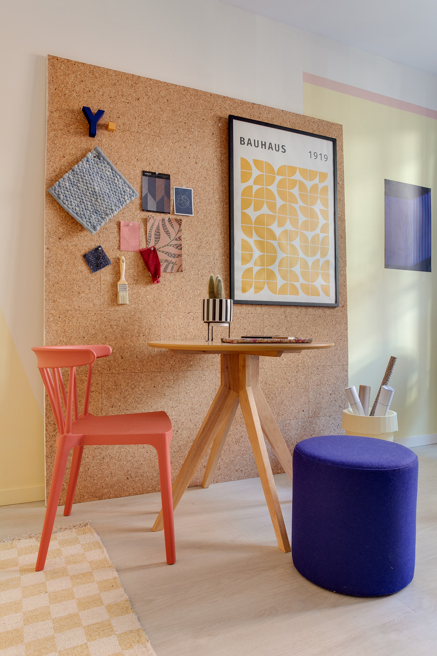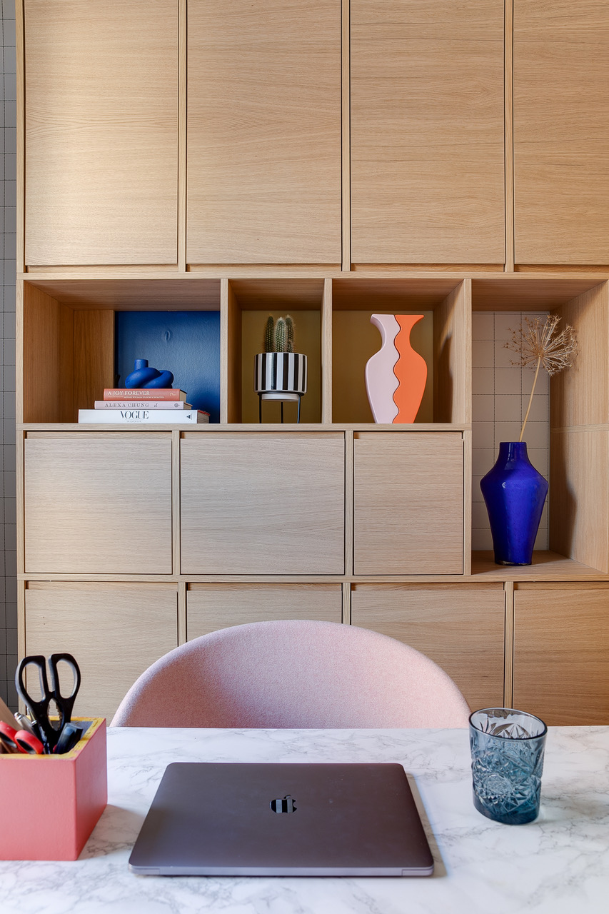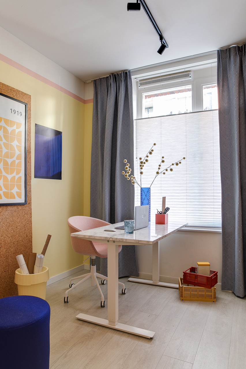 De werkkamer geeft een creatieve sfeer met groot kurken prikbord, vintage Bauhaus-posters en kleurrijke accessoires in geel, roze en blauw. Een witte werktafel op wielen en roze bureaustoel maken de ruimte geschikt voor verschillende shooting-opstellingen. Beide slaapkamers liggen op het oosten en bieden zachte ochtendlichtinval. Een slaapkamer heeft een opvallend houten lattenwerk als hoofdeinde, gecombineerd met donkerblauwe en roze textiel.