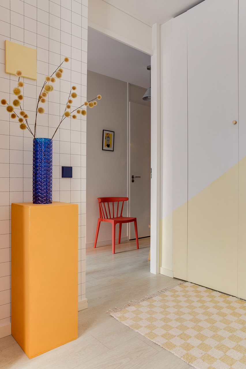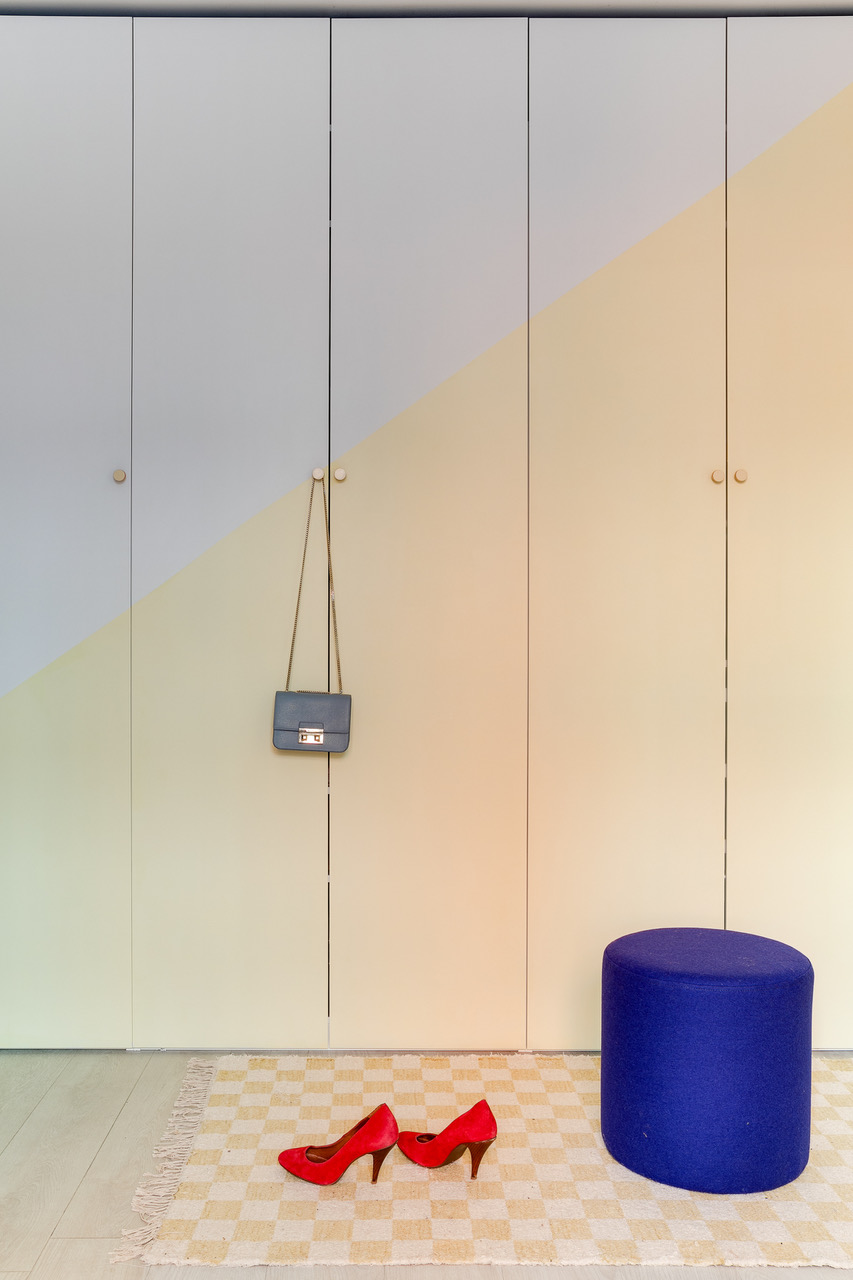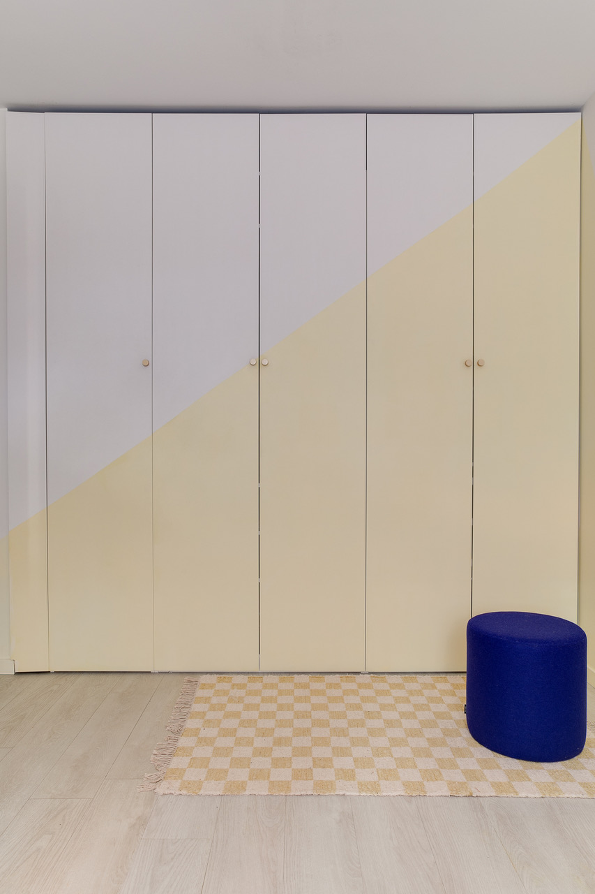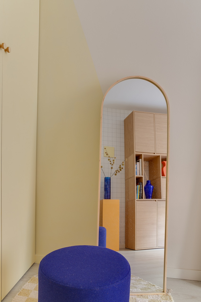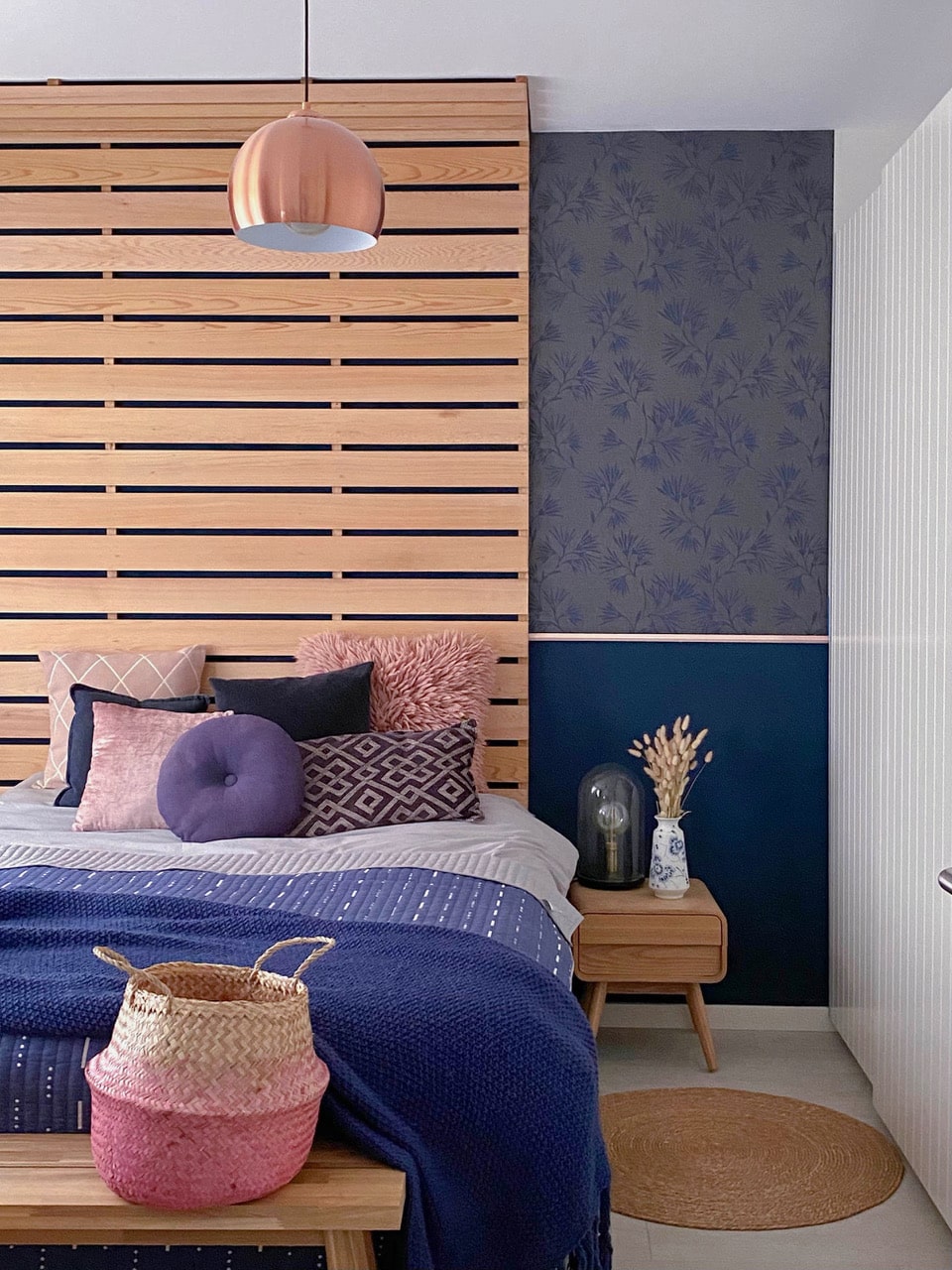 De werkkamer geeft een creatieve sfeer met groot kurken prikbord, vintage Bauhaus-posters en kleurrijke accessoires in geel, roze en blauw. Een witte werktafel op wielen en roze bureaustoel maken de ruimte geschikt voor verschillende shooting-opstellingen. Beide slaapkamers liggen op het oosten en bieden zachte ochtendlichtinval. Een slaapkamer heeft een opvallend houten lattenwerk als hoofdeinde, gecombineerd met donkerblauwe en roze textiel.