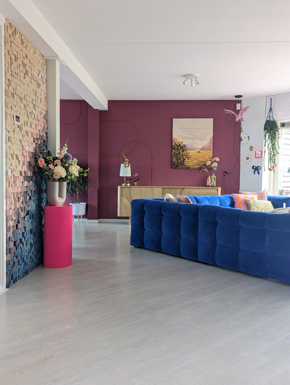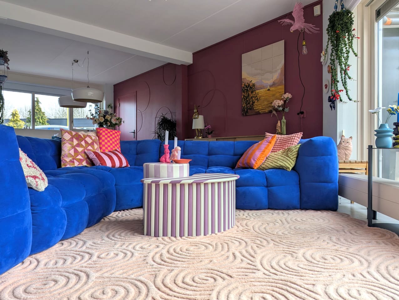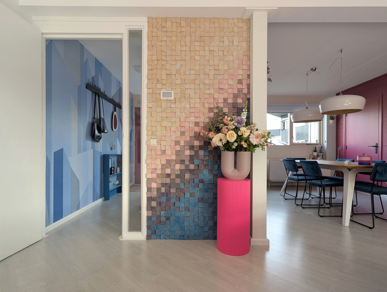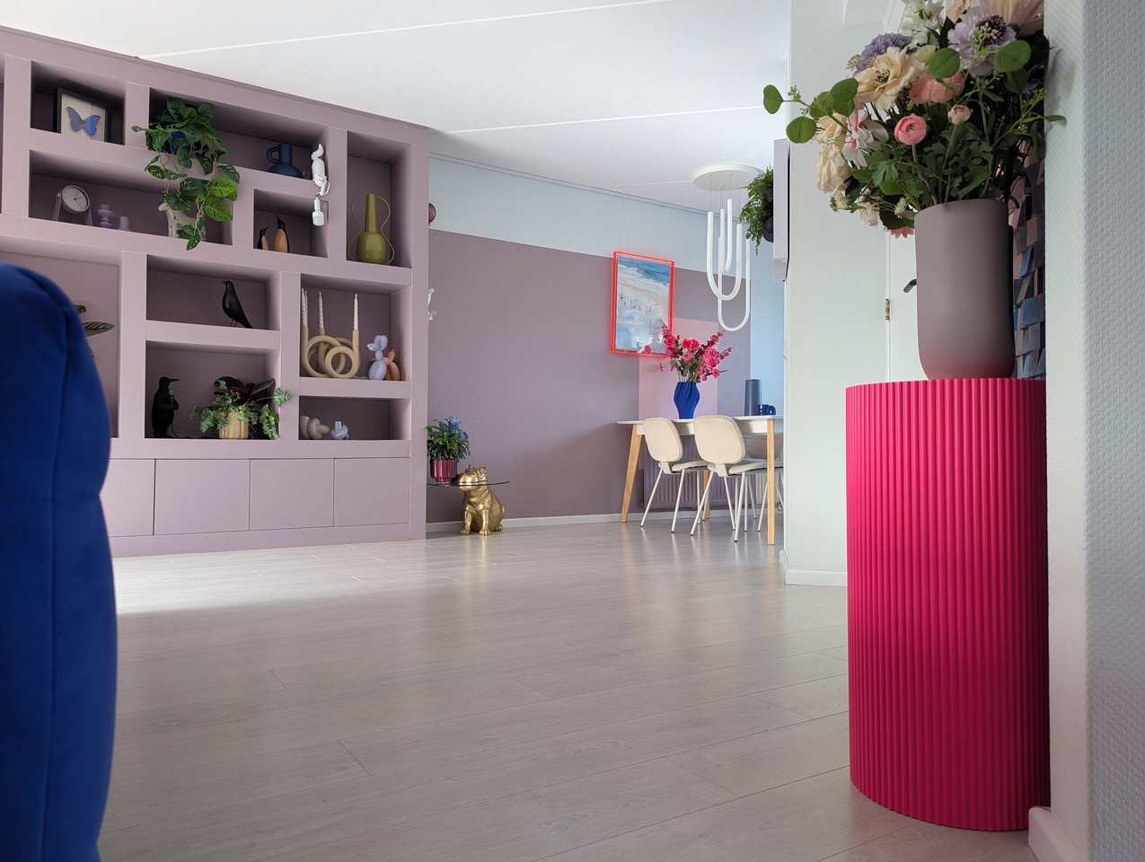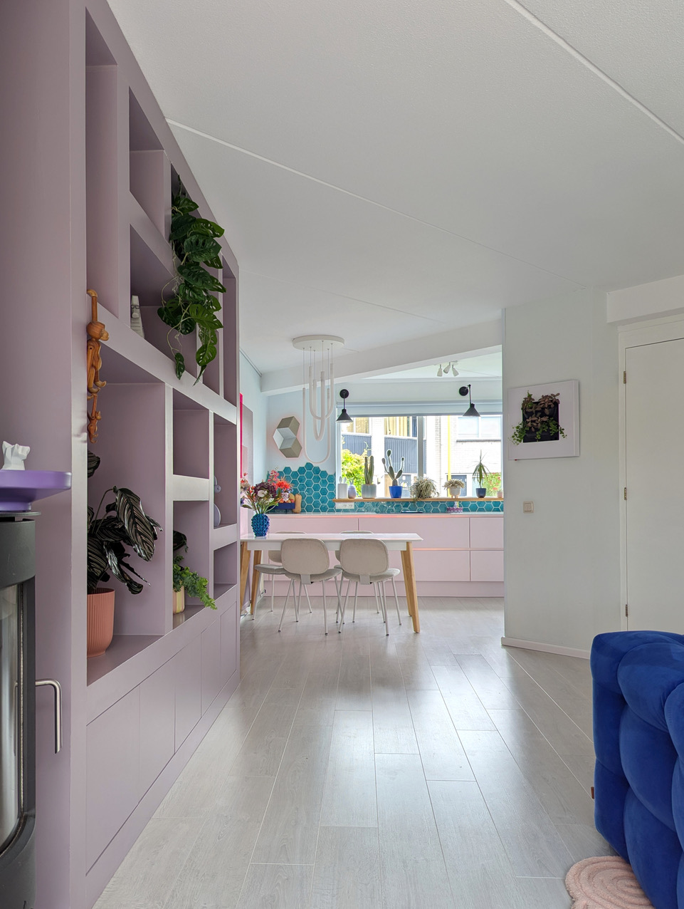 Aan kleur geen gebrek in deze kleurrijke woning met blauwe bank. Deze locatie in Almere pakt uit met een knalblauwe hoekbank op een roze vloerkleed, licht roze keukenkasten met aqua tegels, en een zelfgemaakte blokjesmuur die in 2023 de Karwei Witte Muur Challenge won. Geen grijstinten te bekennen. Alles schreeuwt om aandacht, en dat is precies wat je zoekt voor een shoot die kleur centraal zet. Van de hal tot de slaapkamers: overal kleur.
