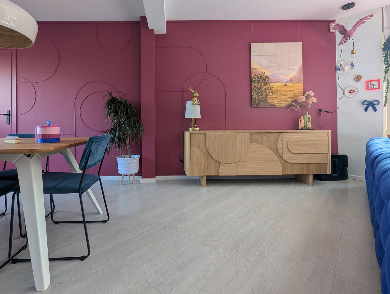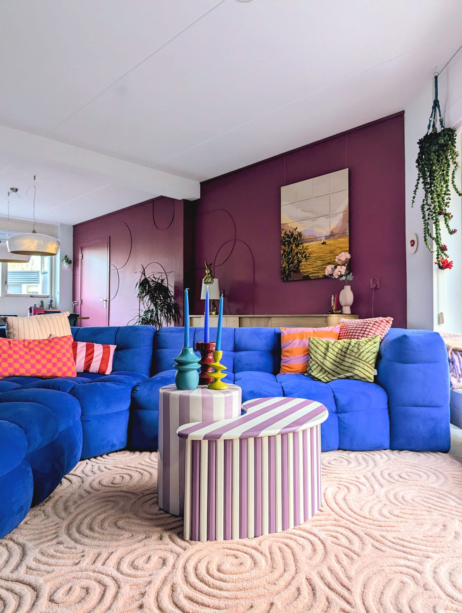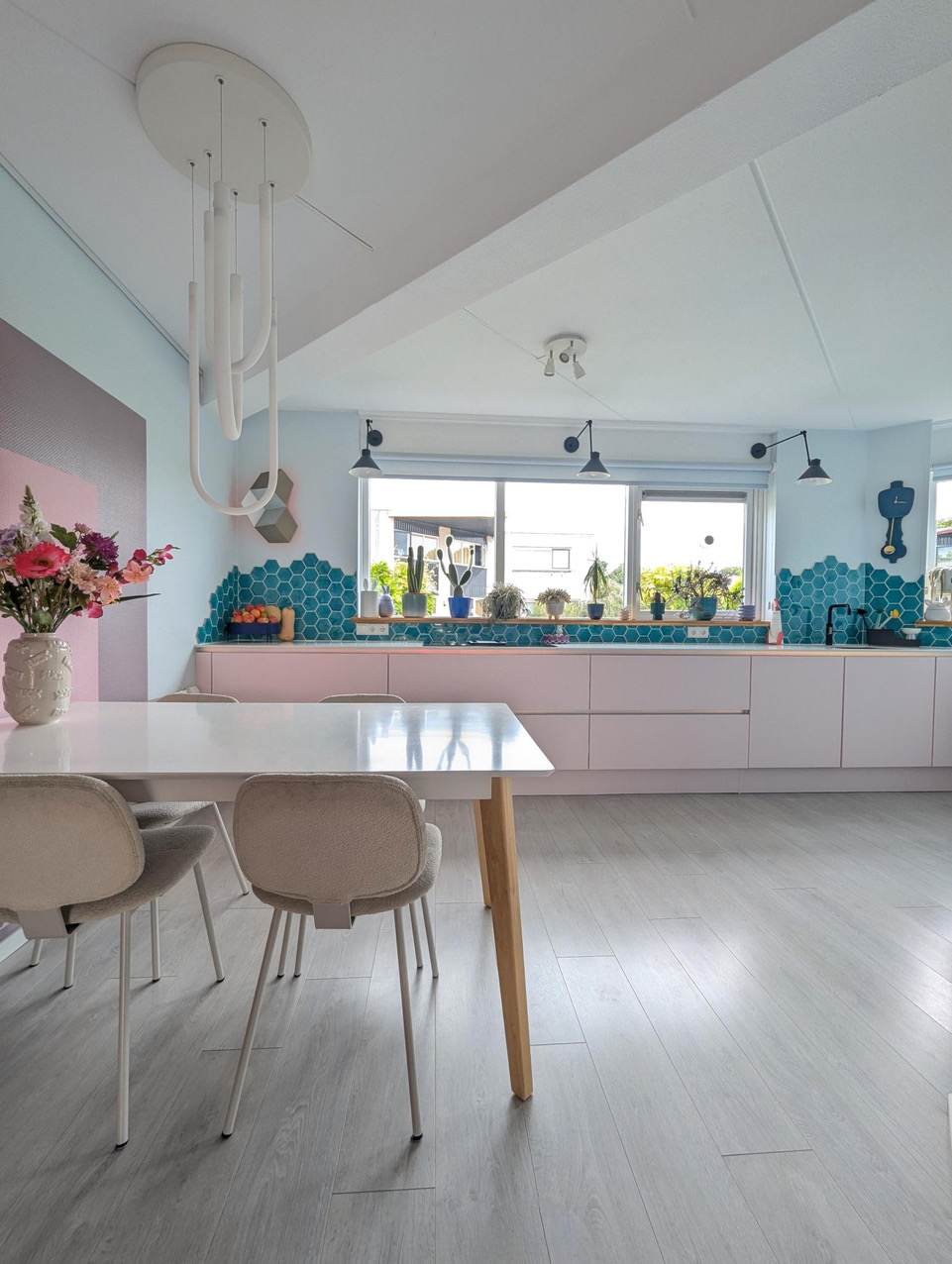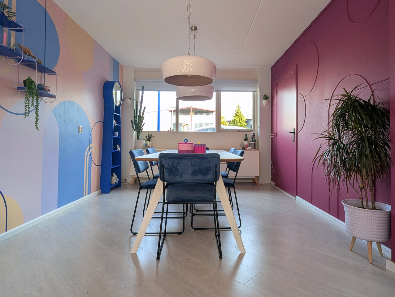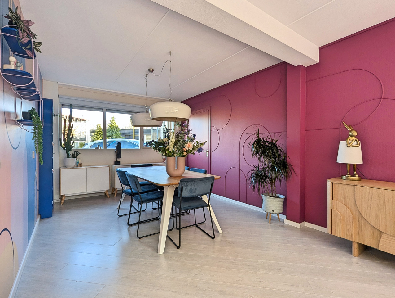 Aan kleur geen gebrek in deze kleurrijke woning met blauwe bank. Deze locatie in Almere pakt uit met een knalblauwe hoekbank op een roze vloerkleed, licht roze keukenkasten met aqua tegels, en een zelfgemaakte blokjesmuur die in 2023 de Karwei Witte Muur Challenge won. Geen grijstinten te bekennen. Alles schreeuwt om aandacht, en dat is precies wat je zoekt voor een shoot die kleur centraal zet. Van de hal tot de slaapkamers: overal kleur.