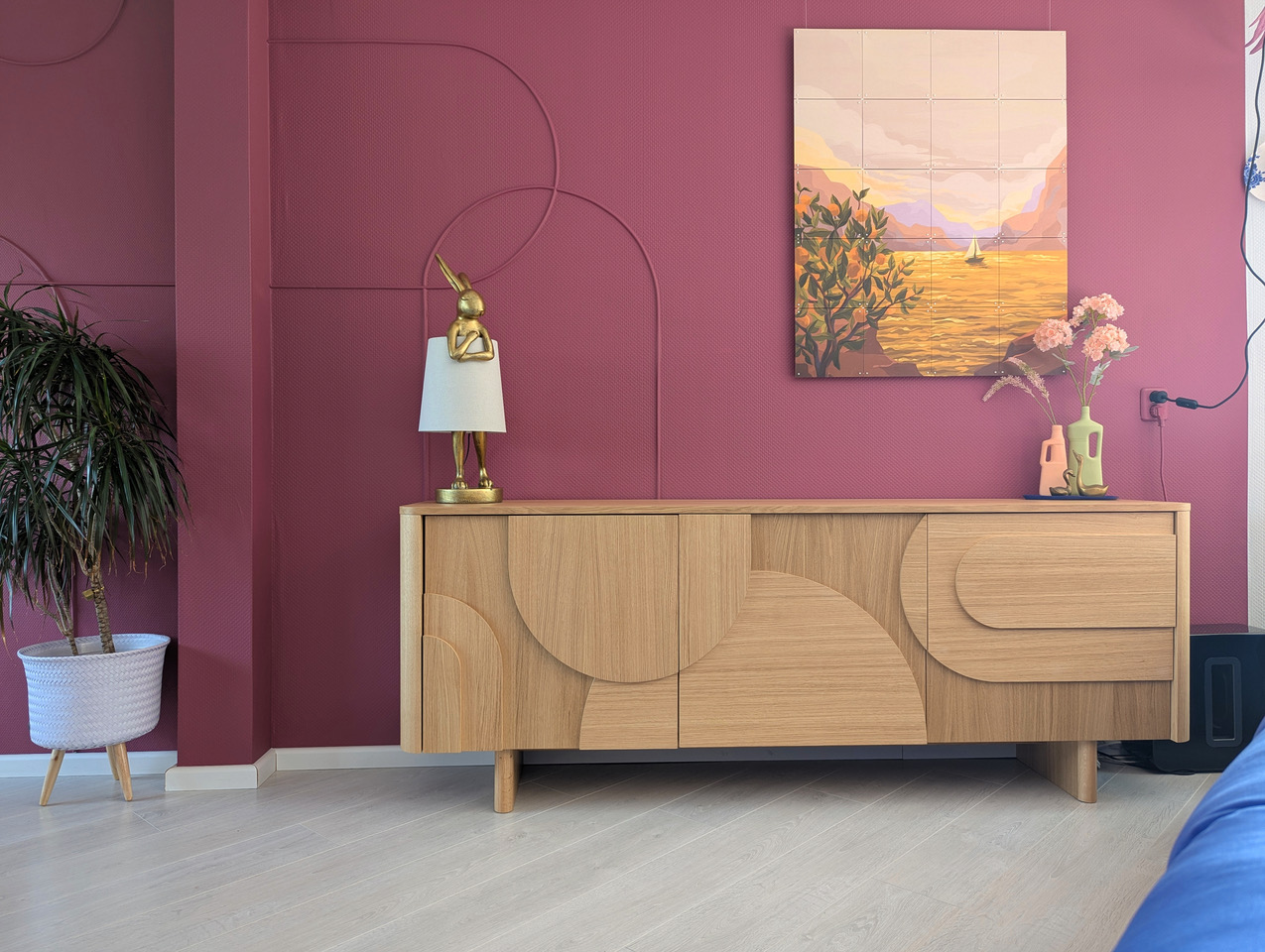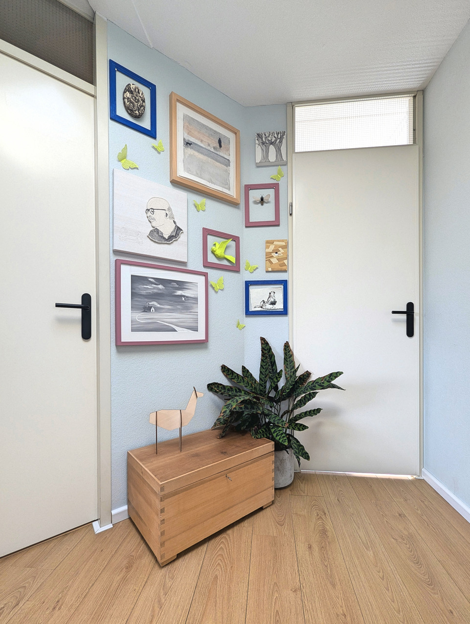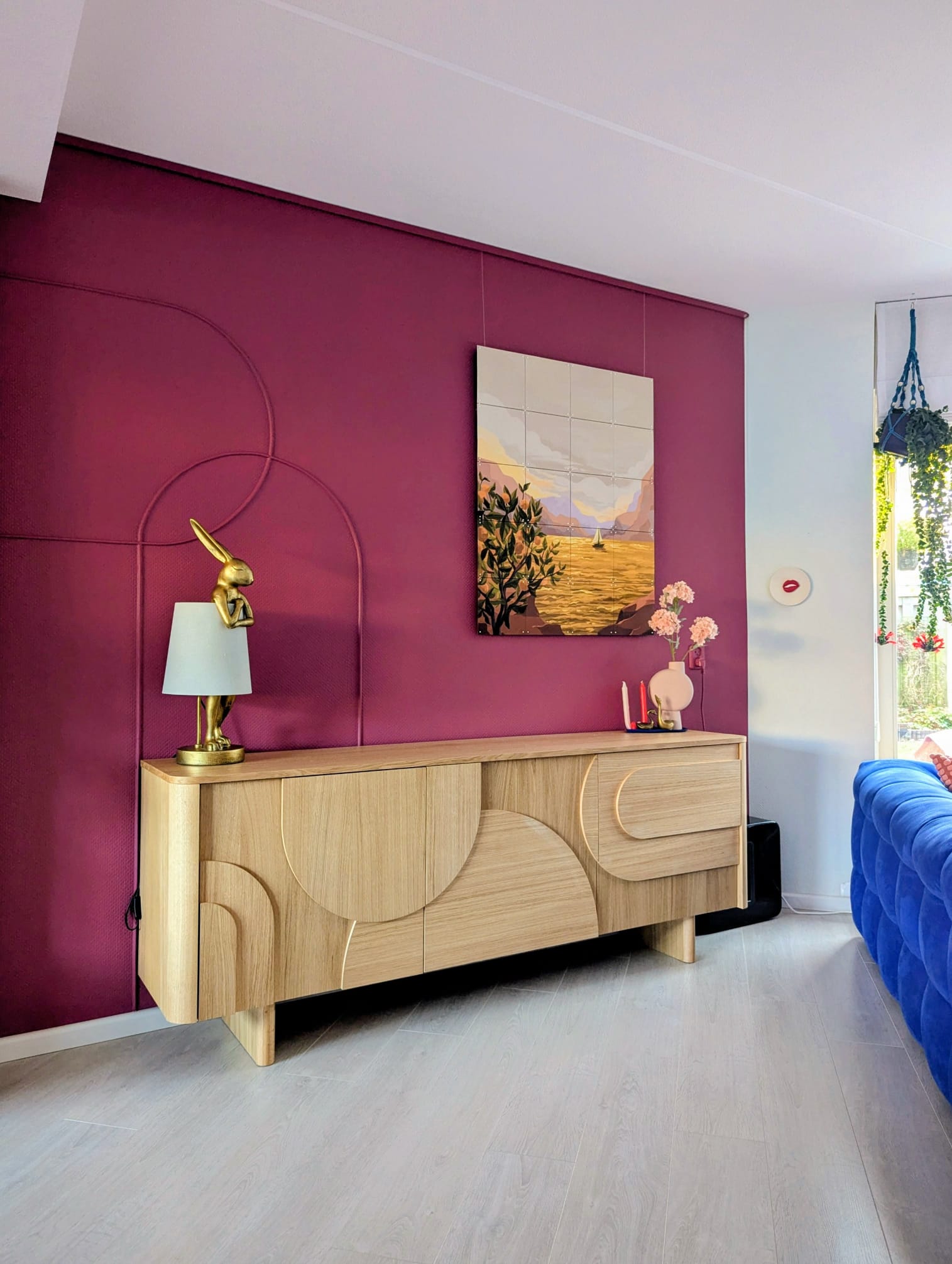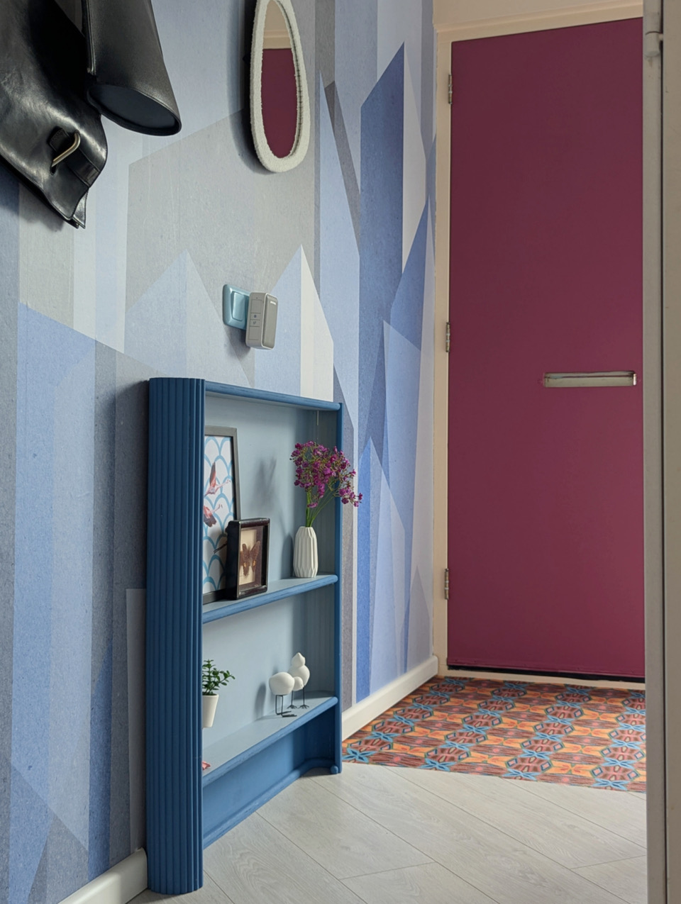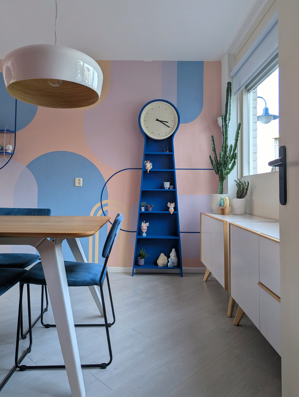 Aan kleur geen gebrek in deze kleurrijke woning met blauwe bank. Deze locatie in Almere pakt uit met een knalblauwe hoekbank op een roze vloerkleed, licht roze keukenkasten met aqua tegels, en een zelfgemaakte blokjesmuur die in 2023 de Karwei Witte Muur Challenge won. Geen grijstinten te bekennen. Alles schreeuwt om aandacht, en dat is precies wat je zoekt voor een shoot die kleur centraal zet. Van de hal tot de slaapkamers: overal kleur.