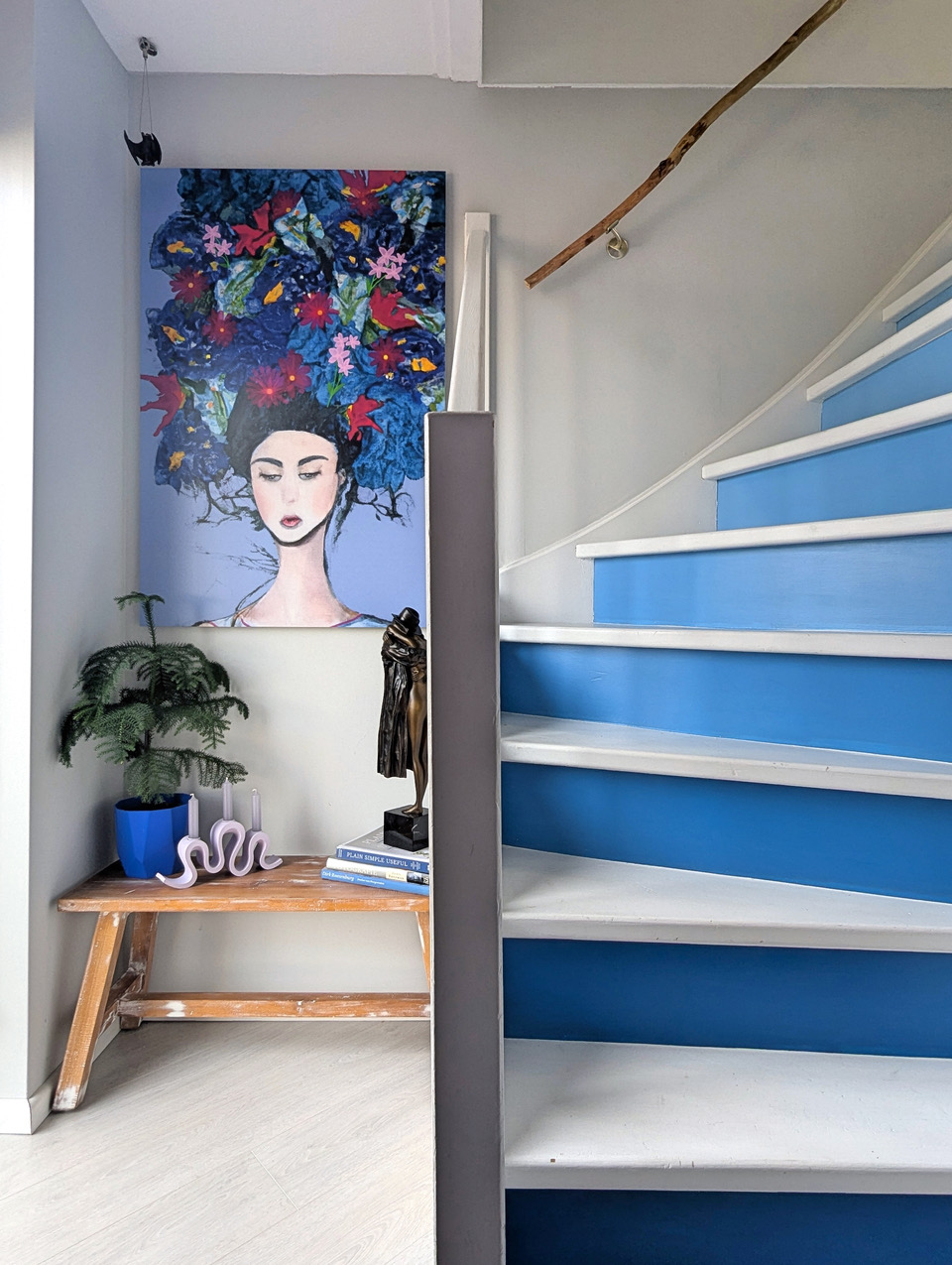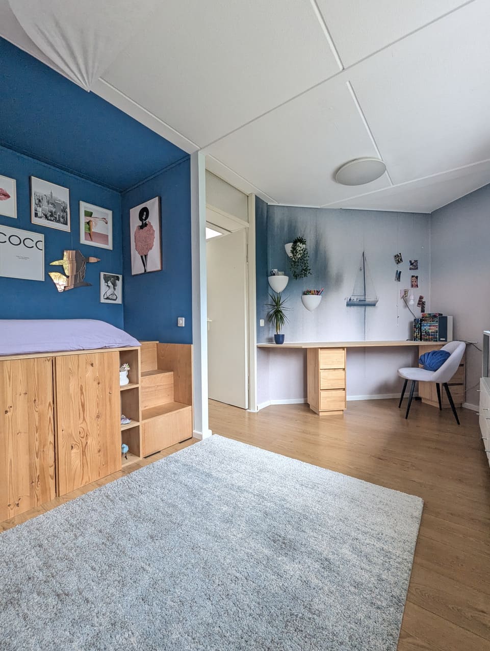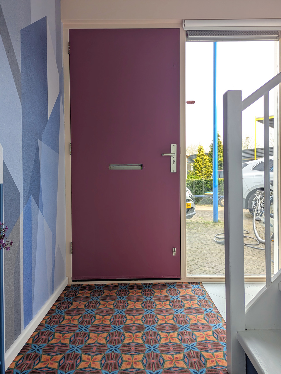 Stap door de voordeur en je weet meteen waar je aan toe bent. Blauw behang links, een blauw-witte trap rechts die van donker naar licht loopt, en een felgekleurde mat onder je voeten. Het toilet onder de trap breekt even met donkere tinten en houten details, maar daarna gaat het weer los. De open woonkamer heeft schuifdeuren naar de tuin en daar staat ie: die knalblauwe hoekbank. Roze vloerkleed eronder, lila tafeltjes erbij, en een gele fauteuil voor de afwisseling. De handgemaakte blokjesmuur steelt de show, die won niet voor niks een prijs. Rechts een Scandinavische eettafel voor zes, links een keuken met een werkblad van 5,5 meter, roze kastjes en aqua 6-hoekige tegels. De hoge kast is groen-blauw. Er is ook een werkruimte van 130m2 aan de woning vast voor als je meer plek nodig hebt.