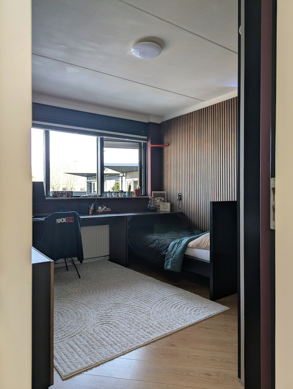 Drie slaapkamers, een badkamer en een waskamer op de bovenverdieping. De ouderslaapkamer heeft pastelkleuren, de puberkamer is bordeauxrood met donkerbruin, en de kinderkamer is weer blauw met een zelfgemaakt bed. De badkamer heeft een lichtblauwe accentmuur, bad, inloopdouche en toilet. Twee parkeerplekken op eigen terrein, Quooker en bonenkoffie aanwezig. Almere is makkelijk te bereiken en de locatie heeft genoeg ruimte voor een crew.