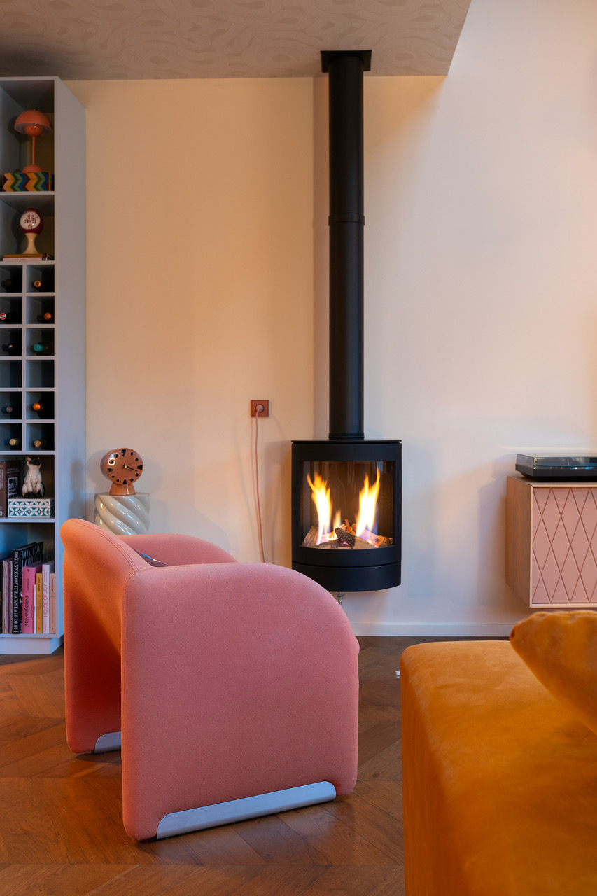 Onder de vide bevindt zich de keuken met roze handgreepjes en kraan. De 3d tegeltjes bedekken de achterwand van de keuken. Het lagere plafond is behangen met een lichtgrijze swirlprint. Verder zijn er op de locatie verschillende design objecten te vinden. De krukjes, lampen en Artifort fauteuil bieden veel mogelijkheden voor verschillende soorten shoots.