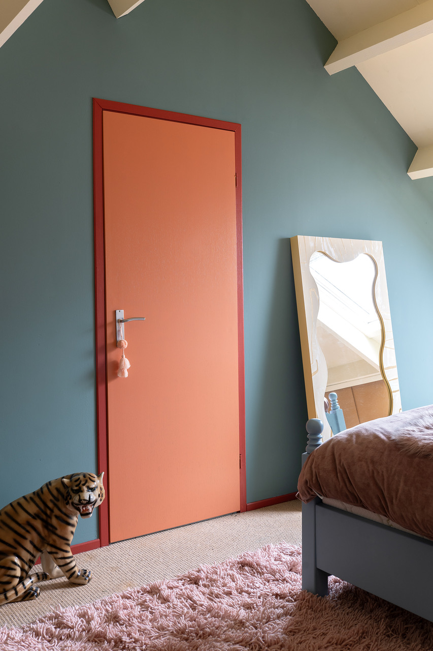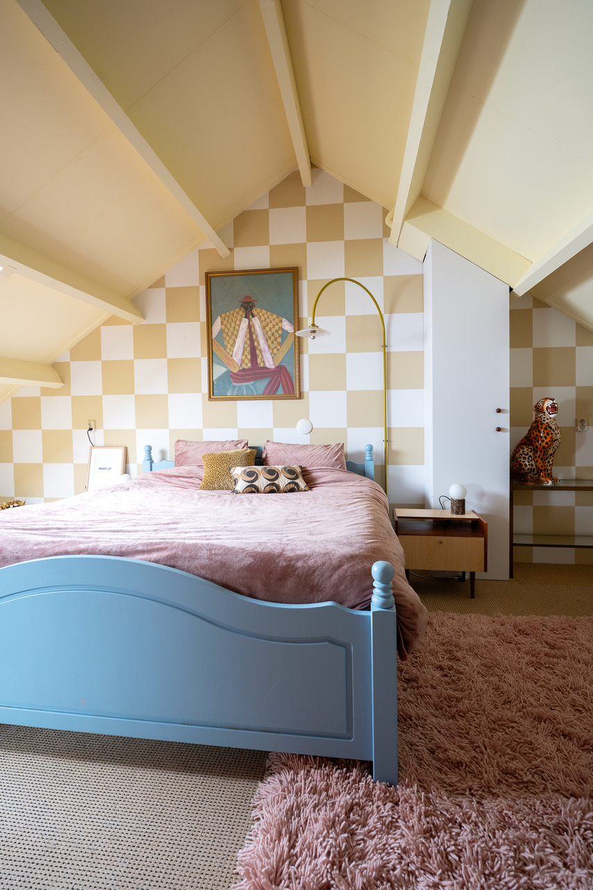 Via de roze trap kom je op de bovenverdieping. Hier vind je naast de slaapkamer en badkamer ook een toffe walk-in-kast. Vanaf de vide heb je ruim zicht op de zithoek en de woonkamer. Dit biedt veel mogelijkheden camera technisch om verschillende shots van boven af te nemen. De kleurrijke slaapkamer met design behang is een echte eyecatcher. Daarnaast is er ook een lichte ruime logeerkamer op zolder met wit hoog plafond en geblokt geschilderde muur.