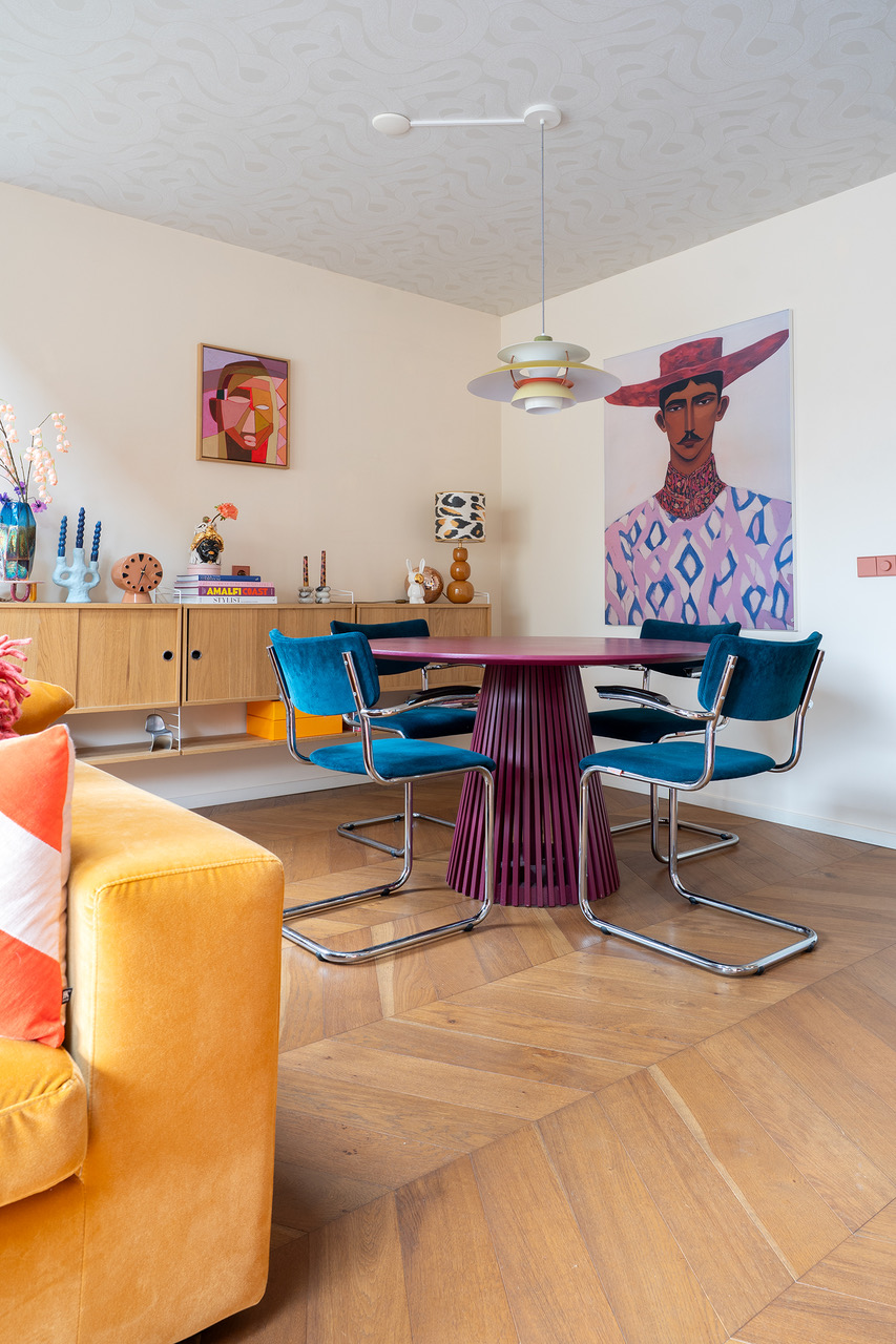 Deze locatie kenmerkt zich door de vide in de woonkamer, met hoog donkerblauw plafond en lichtinval aan alle kanten. Doordat het een hoekwoning is heeft het ramen aan de achter-zijkant en in het hoge plafond. Aan natuurlijk licht dus geen gebrek. De 3 meter hoge gordijnen in combinatie met de houten Hongaarse punt vloer geeft de locatie een luxe uitstraling.
