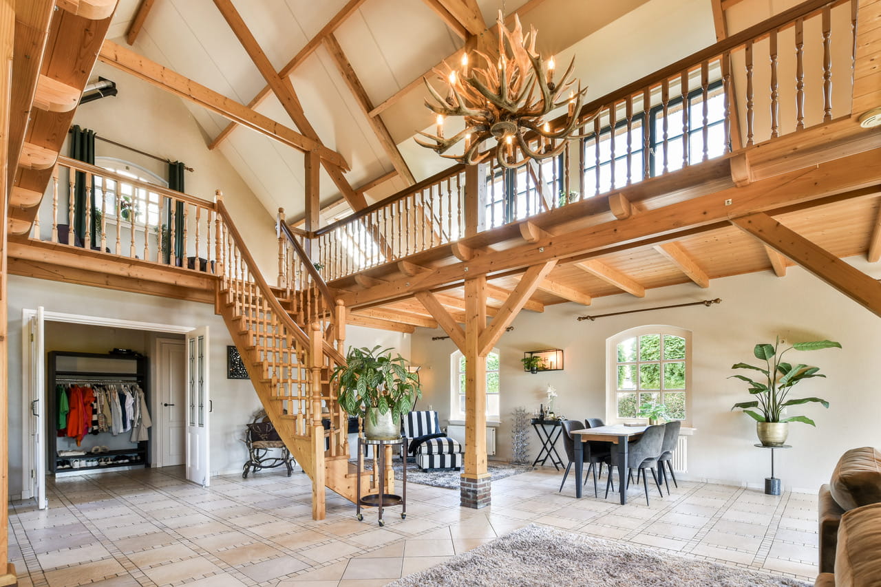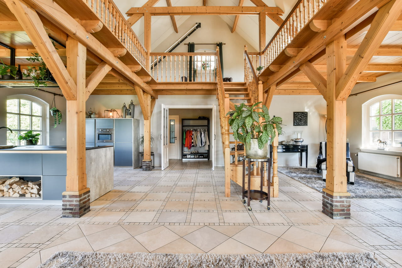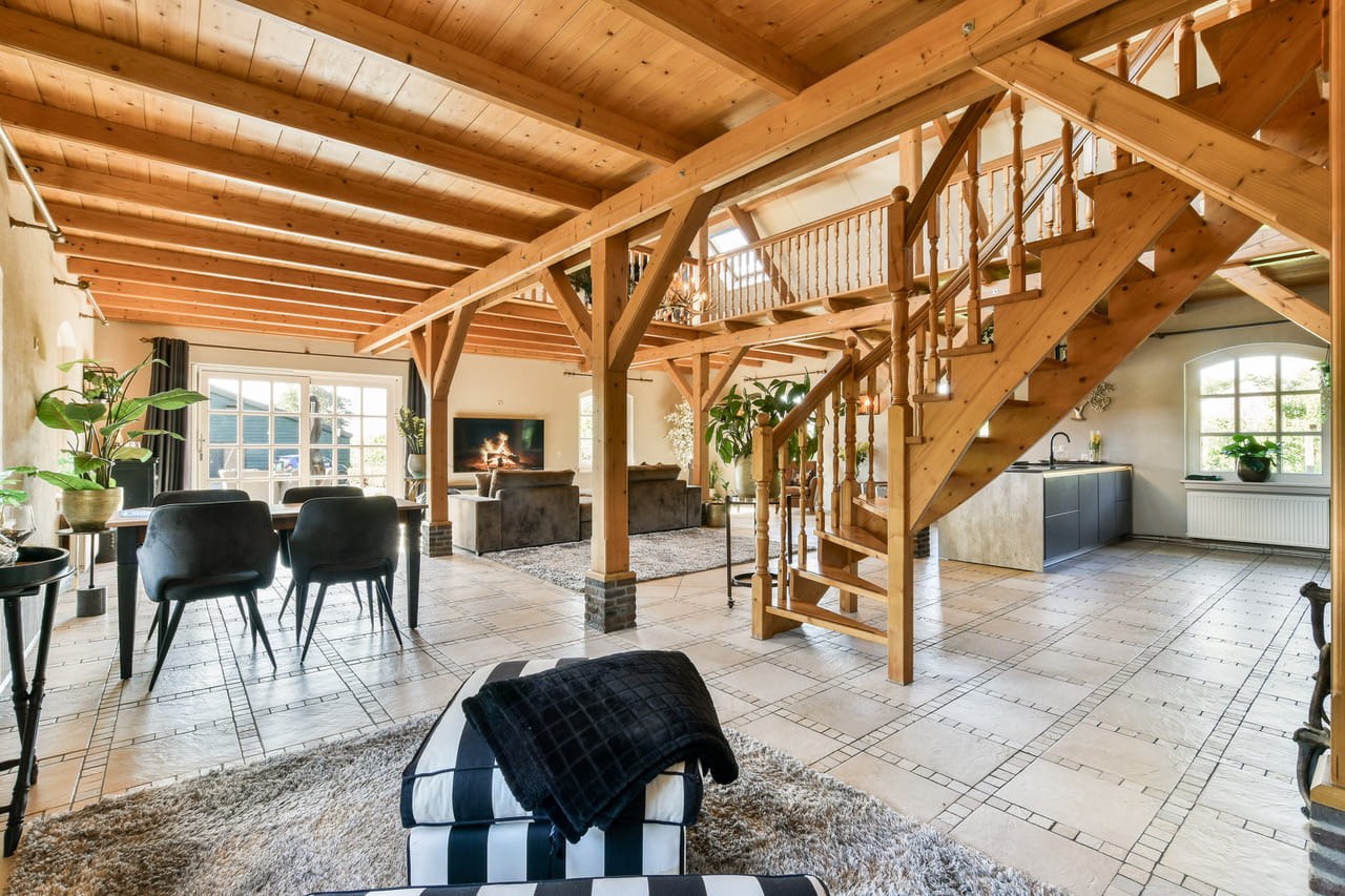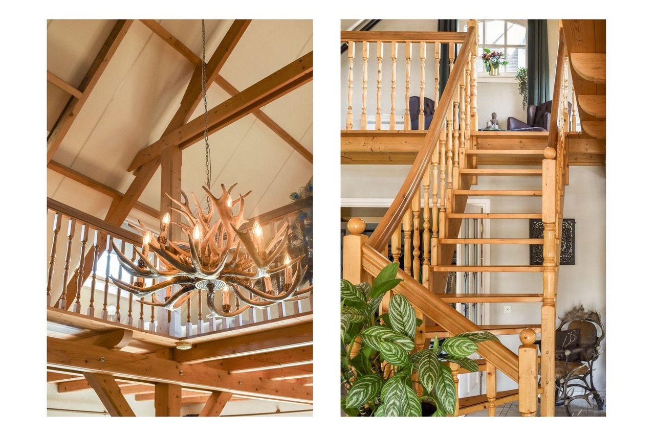 Binnen tref je een leefruimte van zo’n 110m² met houten gebinten die hoog boven je hoofd samenkomen. Openslaande deuren richting de tuin, een complete keuken in dezelfde open ruimte en overal dat warme, zachte daglicht. De sfeer zit er al in, jij hoeft alleen nog je camera neer te zetten. Een prachtige houten trap brengt je naar de vide op de eerste verdieping, waar je uitkijkt over de hele ruimte én over de polder achter het huis.