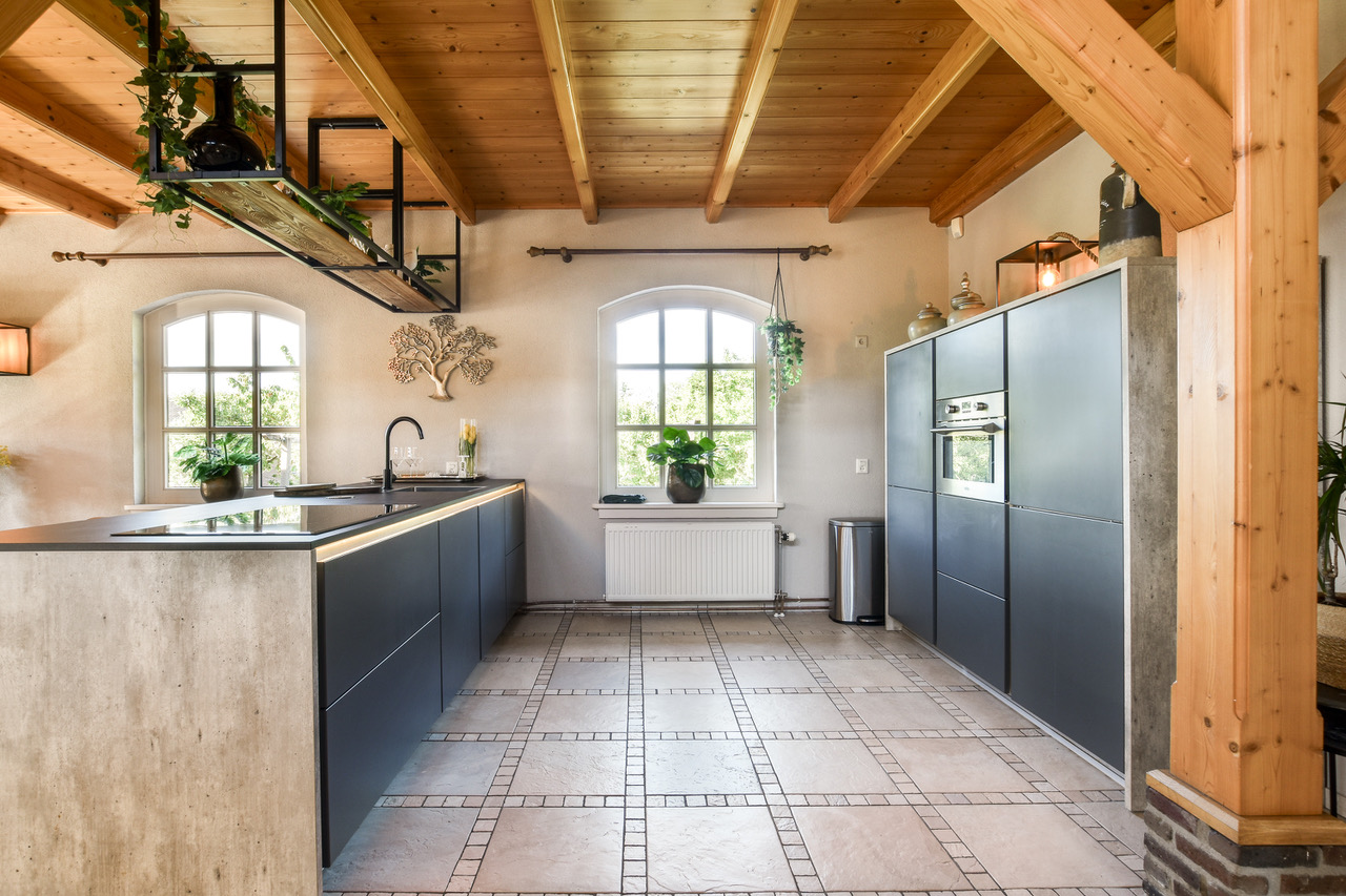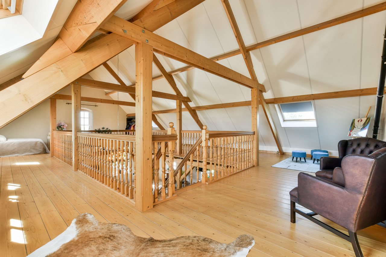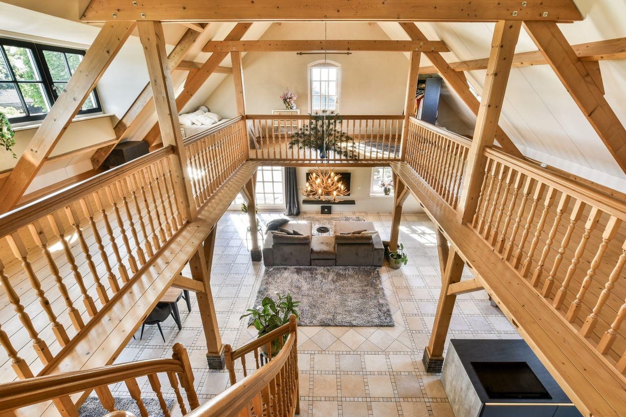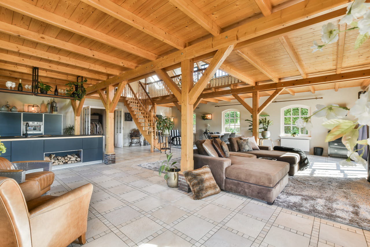 Binnen tref je een leefruimte van zo’n 110m² met houten gebinten die hoog boven je hoofd samenkomen. Openslaande deuren richting de tuin, een complete keuken in dezelfde open ruimte en overal dat warme, zachte daglicht. De sfeer zit er al in, jij hoeft alleen nog je camera neer te zetten. Een prachtige houten trap brengt je naar de vide op de eerste verdieping, waar je uitkijkt over de hele ruimte én over de polder achter het huis.
