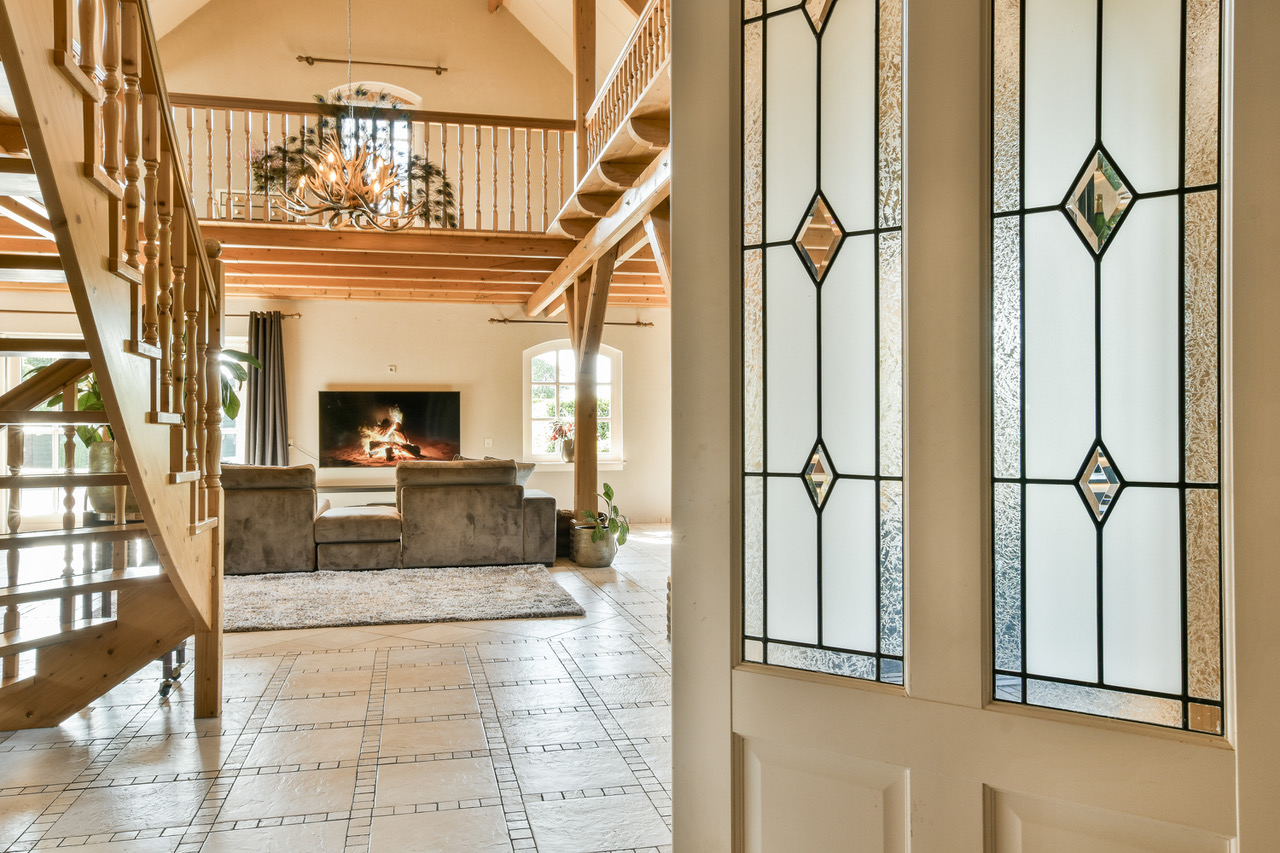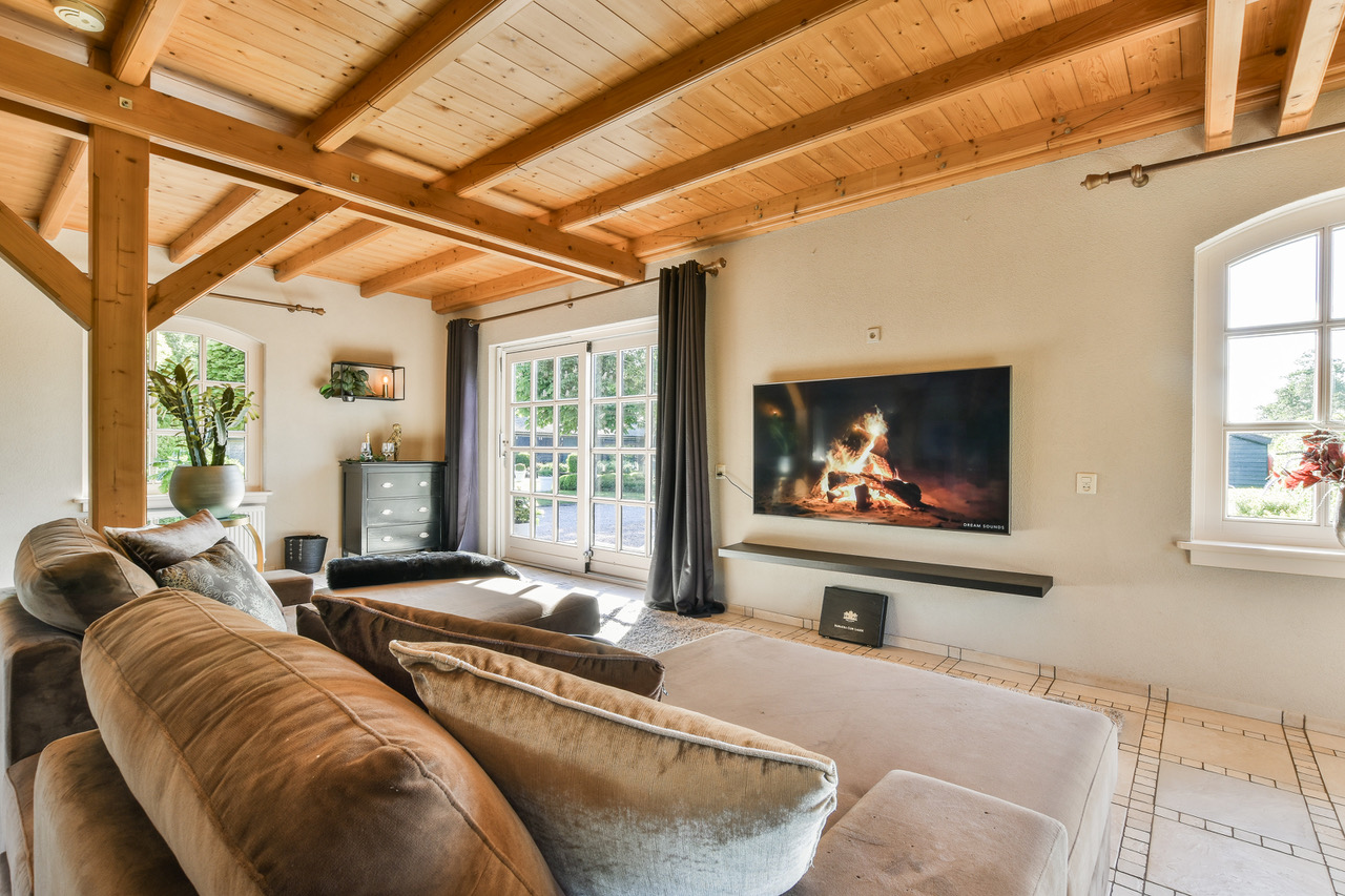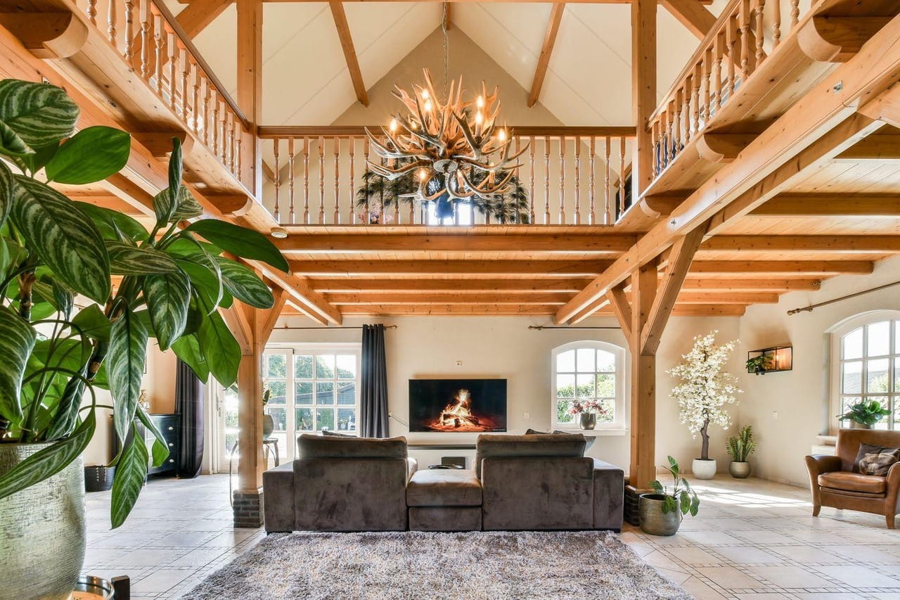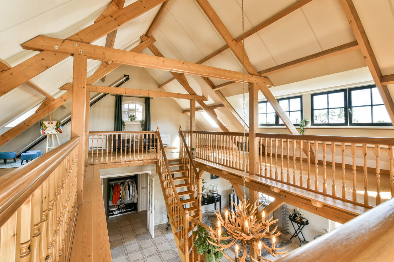 Binnen tref je een leefruimte van zo’n 110m² met houten gebinten die hoog boven je hoofd samenkomen. Openslaande deuren richting de tuin, een complete keuken in dezelfde open ruimte en overal dat warme, zachte daglicht. De sfeer zit er al in, jij hoeft alleen nog je camera neer te zetten. Een prachtige houten trap brengt je naar de vide op de eerste verdieping, waar je uitkijkt over de hele ruimte én over de polder achter het huis.