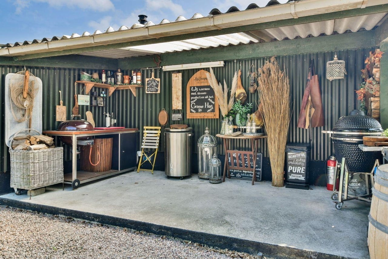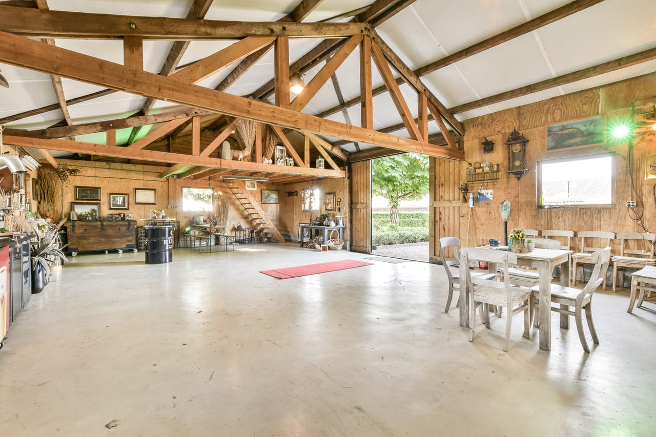 Naast de boerderij staat de wagenschuur, door de eigenaar ‘het café’ genoemd. Met 143m², grote schuifdeuren en een rauwe betonvloer heeft deze ruimte een totaal andere energie dan het woongedeelte. Super flexibel en ideaal als je op één dag meerdere settings wil schieten.