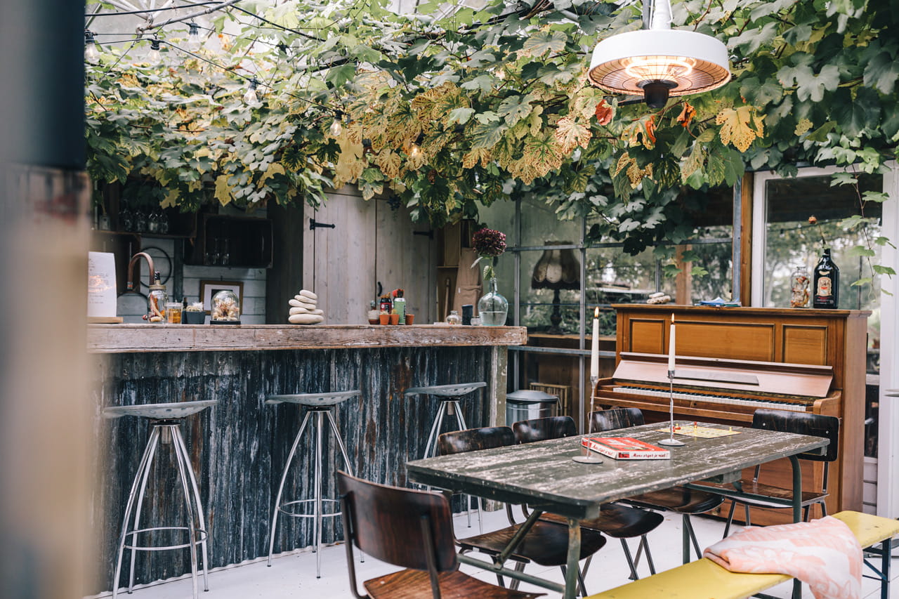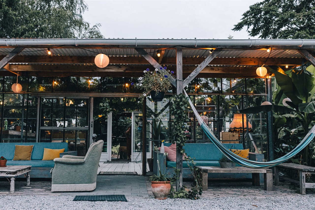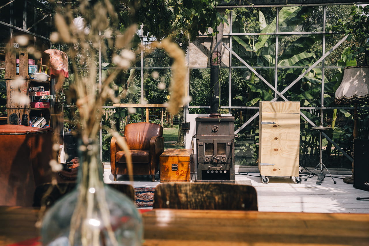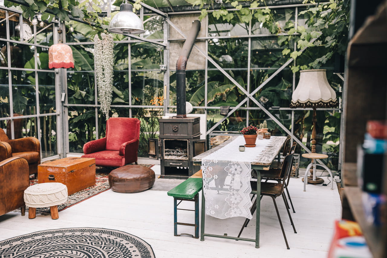 Deze plantenkas is getransformeerd tot een sfeervolle open huiskamer, compleet met een bar en kachel. Het glazen dak en de wanden zorgen voor een overvloed aan natuurlijk licht. Dit maakt de locatie perfect voor shoots die een heldere en luchtige sfeer vereisen.