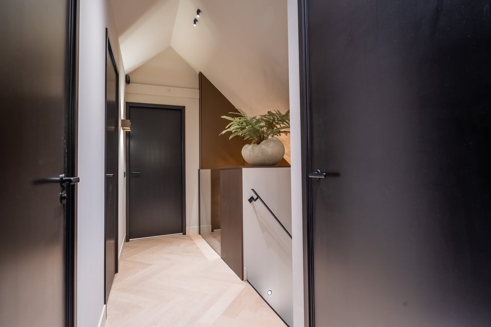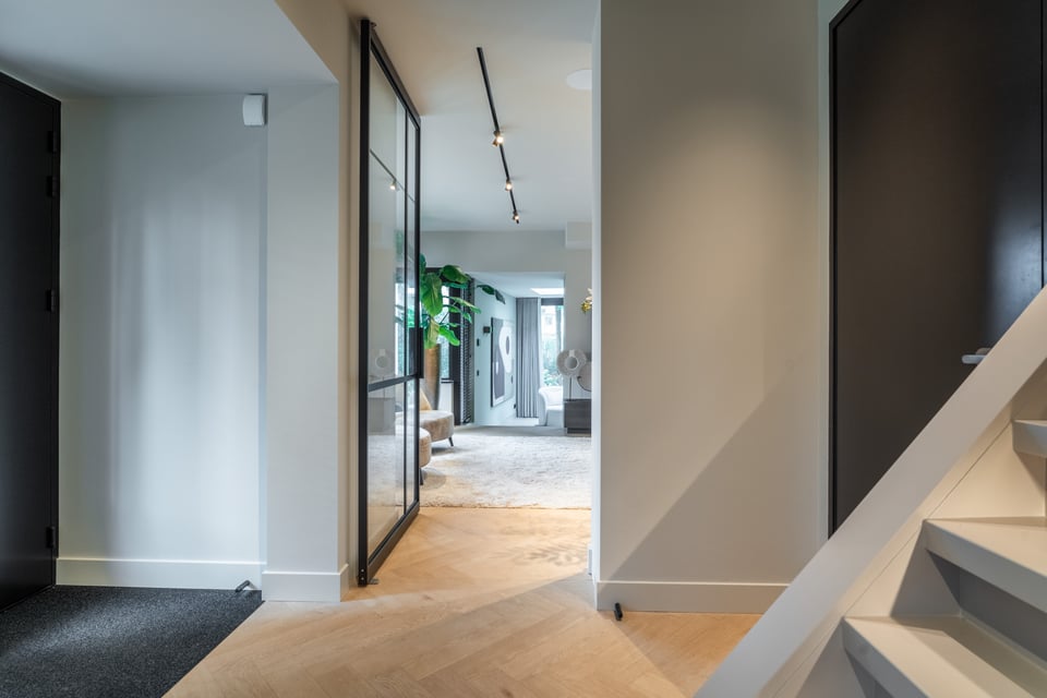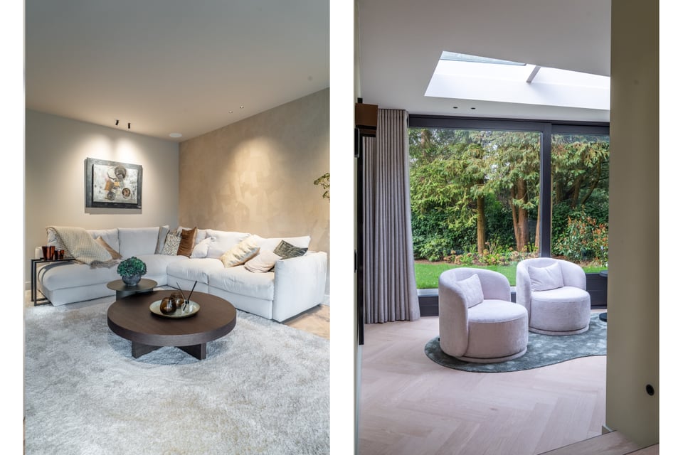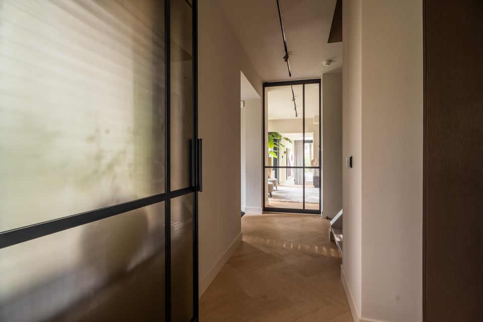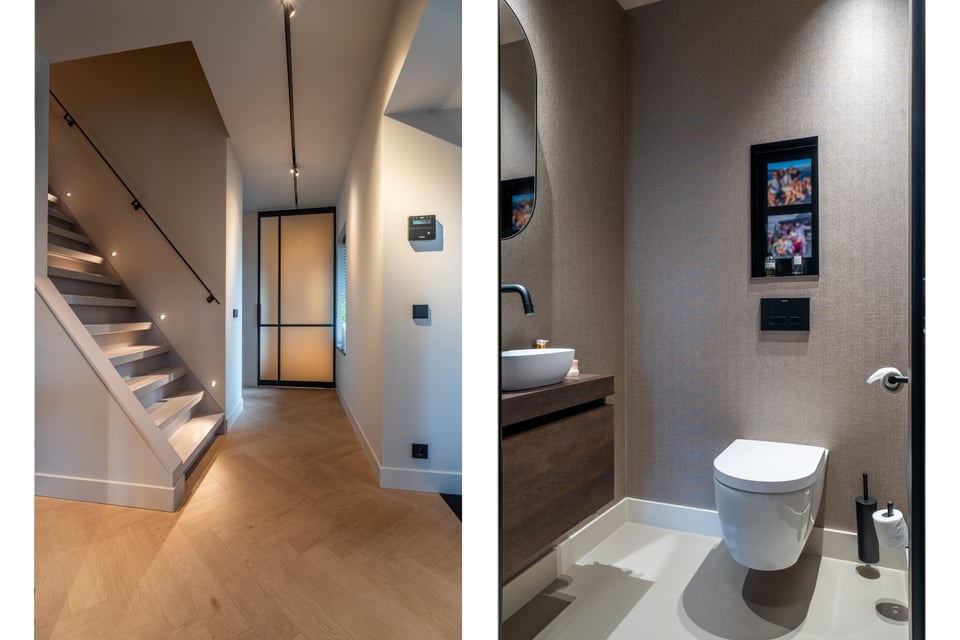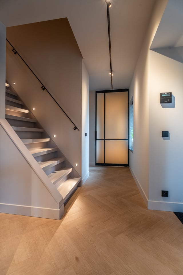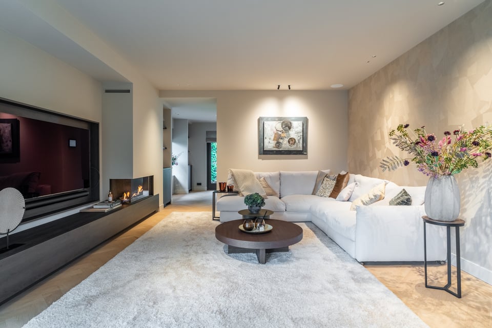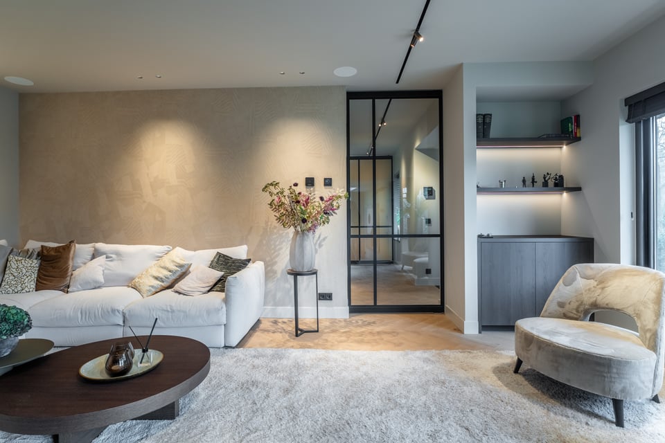 Je komt binnen via een moderne hal met visgraatparket en een strakke trap met ingebouwde verlichting. De woonkamer heeft een rustige, neutrale sfeer met warme materialen. Een slanke bioethanol haard, een grote loungebank en structuurwanden zorgen voor een setting die tegelijk modern en knus aanvoelt. Via een stalen deur loop je door naar de rest van de begane grond.