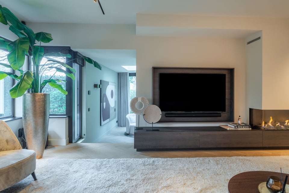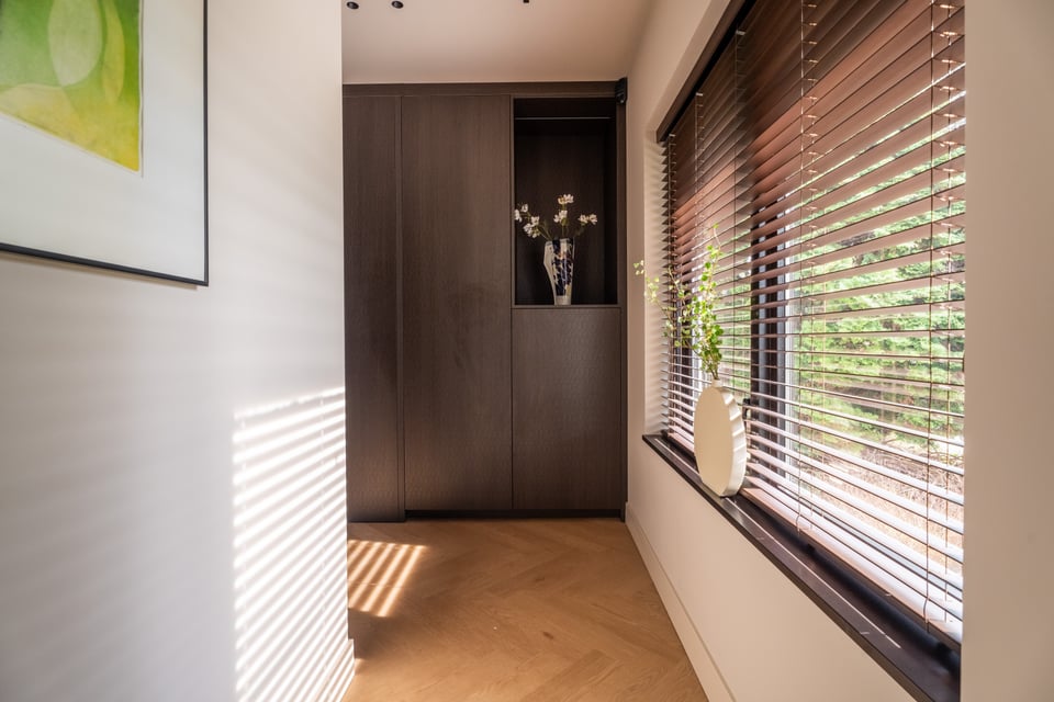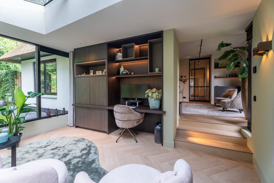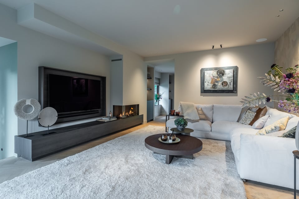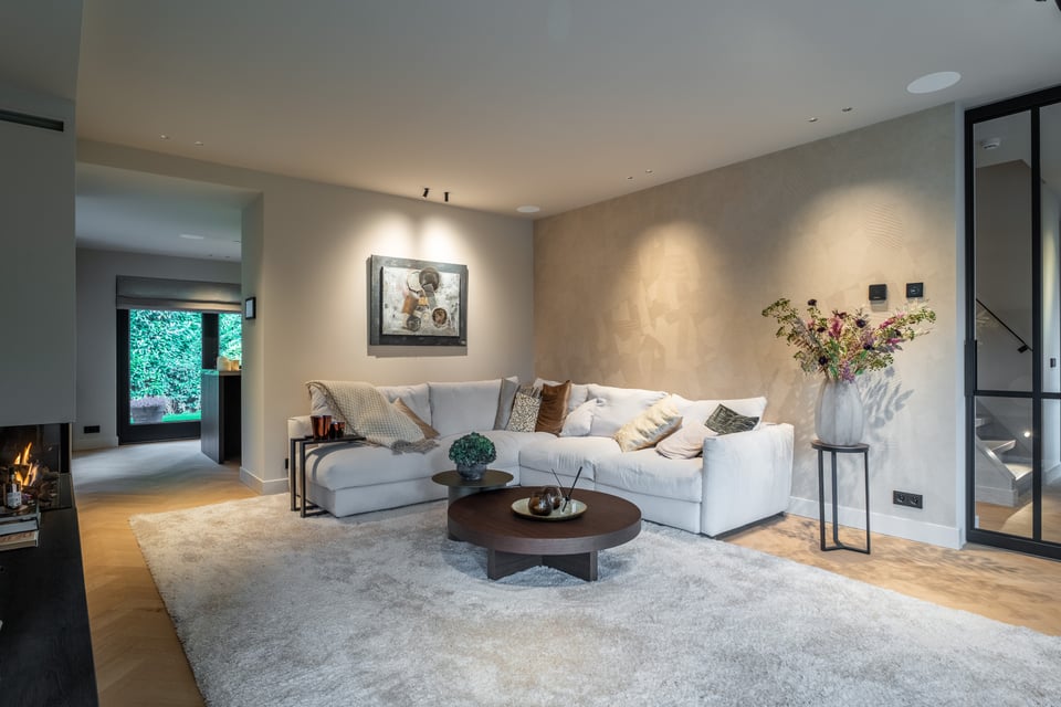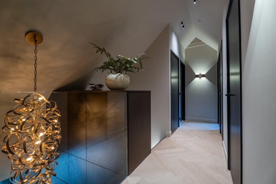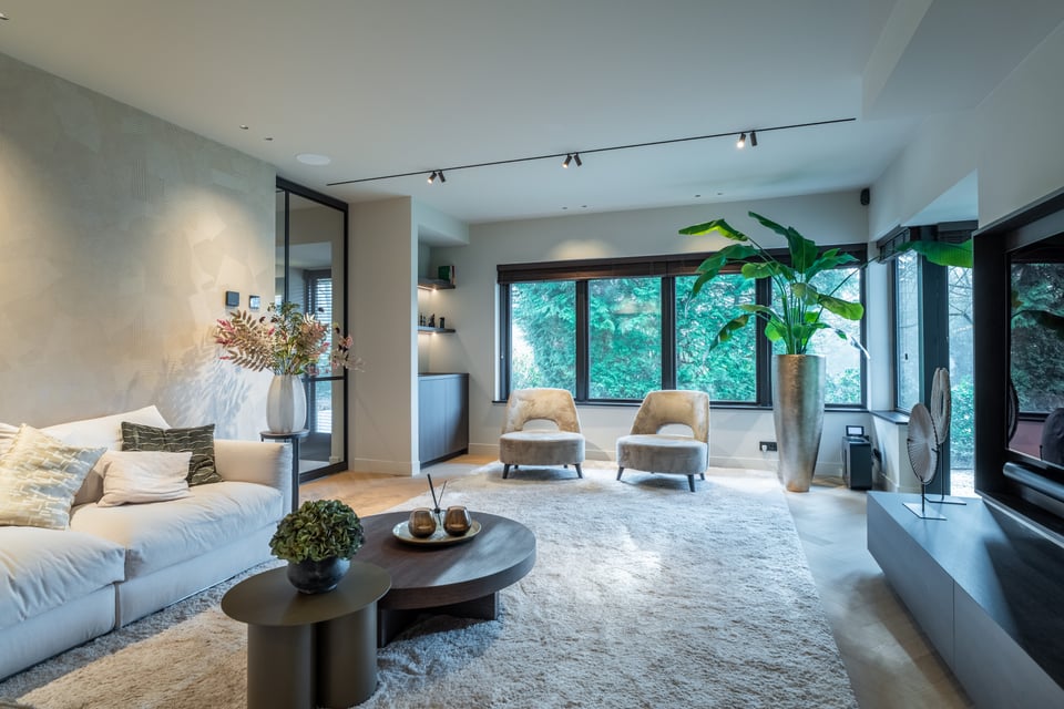 Je komt binnen via een moderne hal met visgraatparket en een strakke trap met ingebouwde verlichting. De woonkamer heeft een rustige, neutrale sfeer met warme materialen. Een slanke bioethanol haard, een grote loungebank en structuurwanden zorgen voor een setting die tegelijk modern en knus aanvoelt. Via een stalen deur loop je door naar de rest van de begane grond.