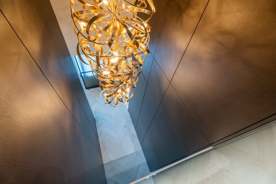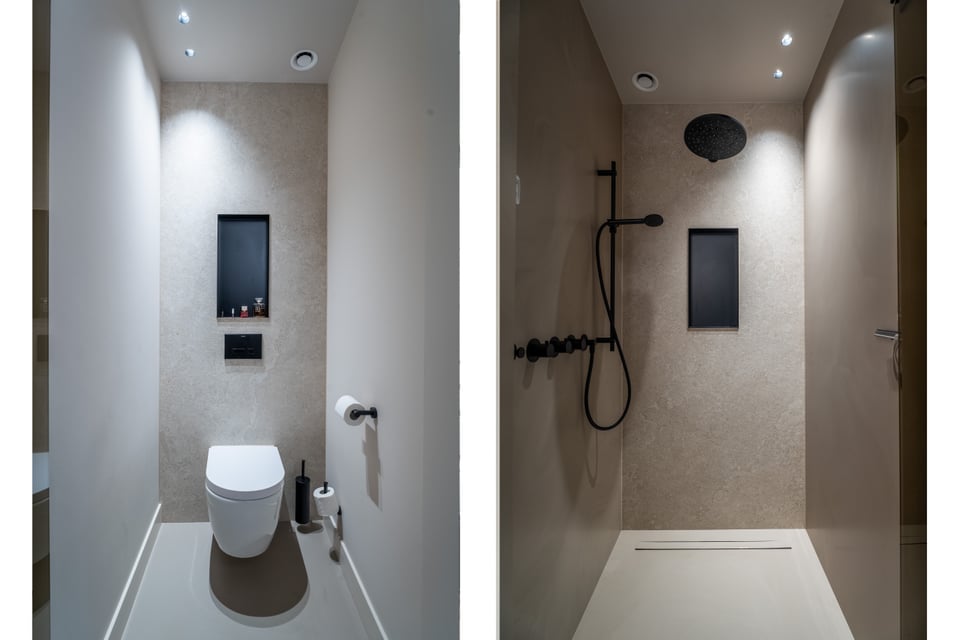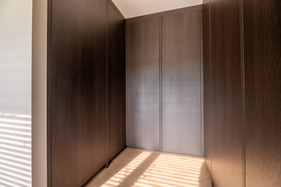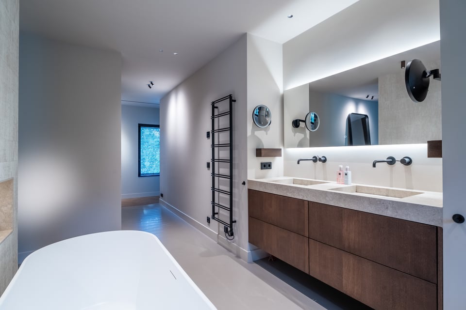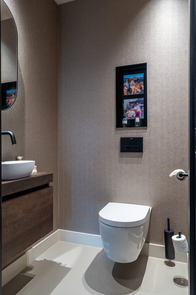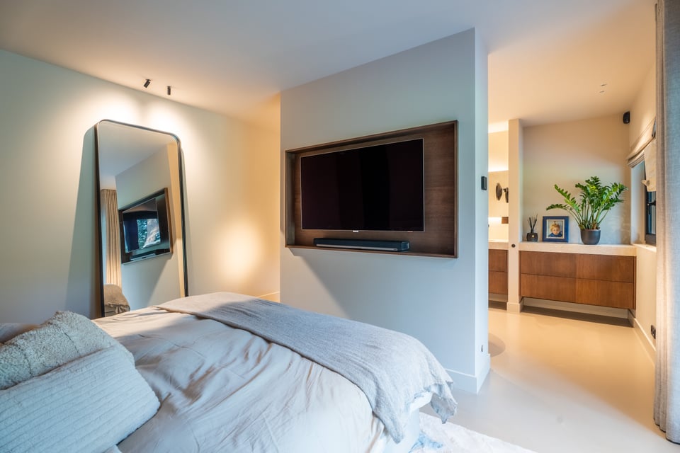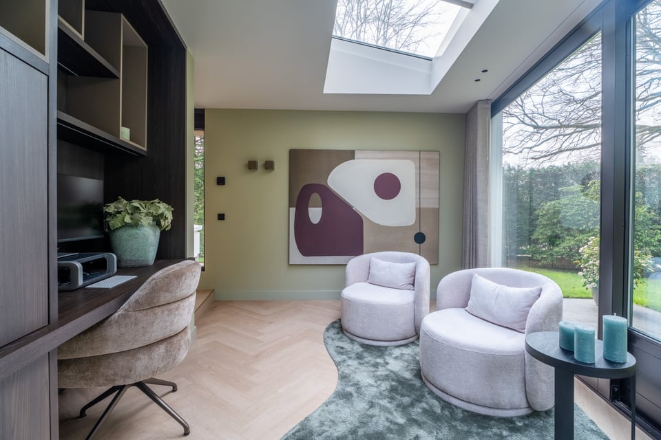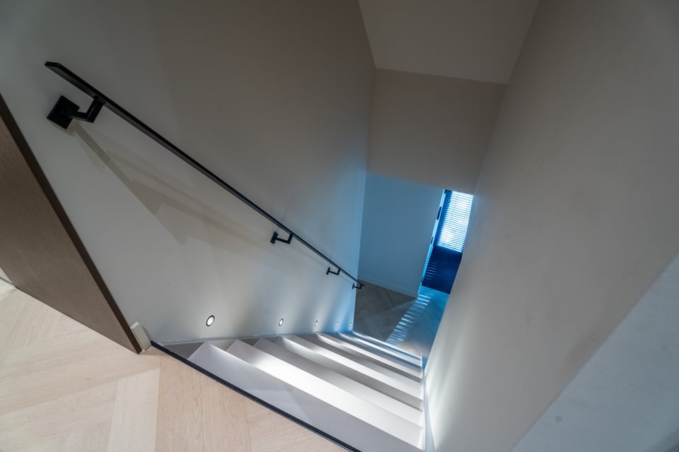 Je komt binnen via een moderne hal met visgraatparket en een strakke trap met ingebouwde verlichting. De woonkamer heeft een rustige, neutrale sfeer met warme materialen. Een slanke bioethanol haard, een grote loungebank en structuurwanden zorgen voor een setting die tegelijk modern en knus aanvoelt. Via een stalen deur loop je door naar de rest van de begane grond.