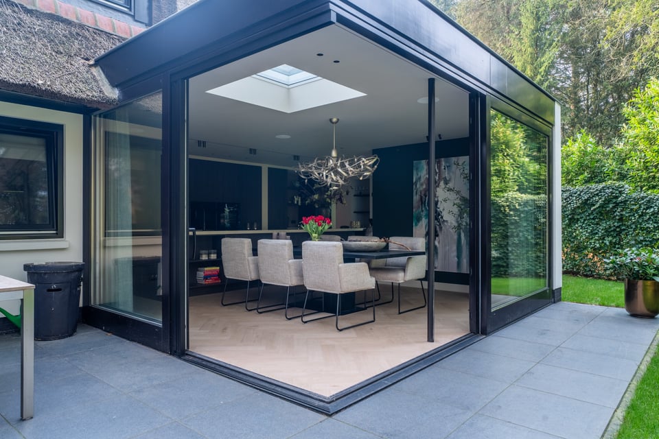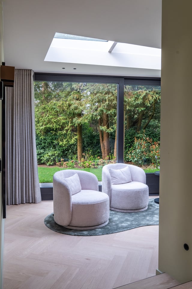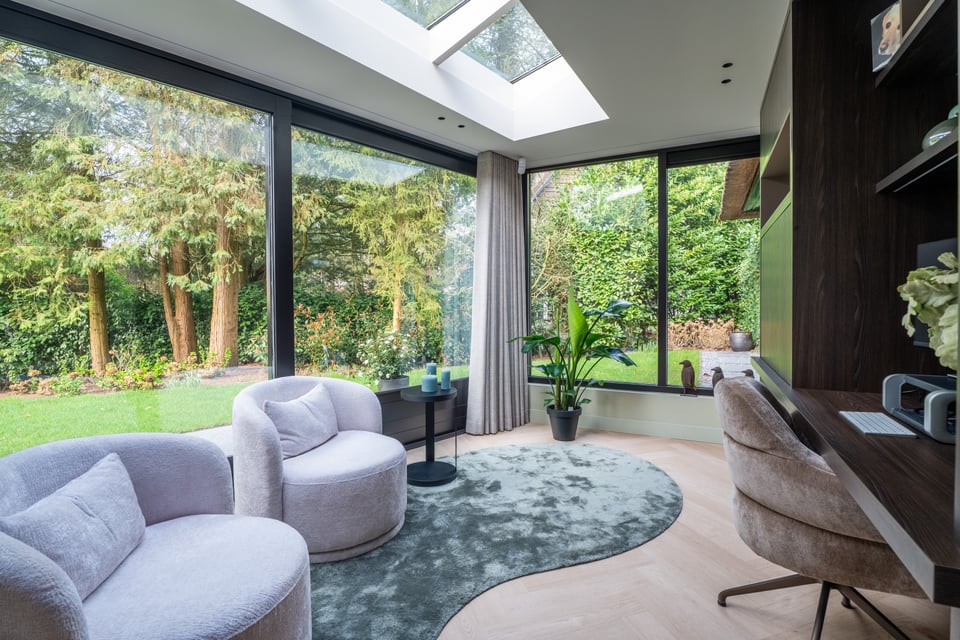 Dit is de eyecatcher van de locatie. Een ruime tuinkamer met vloer-tot-plafond glaswanden aan drie zijden en een groot dakraam. Buiten de tuin, binnen het licht, de hele dag door. Ideaal voor lifestyle shoots waarbij je die zachte, natuurlijke belichting wil zonder dat je er iets voor hoeft te doen.