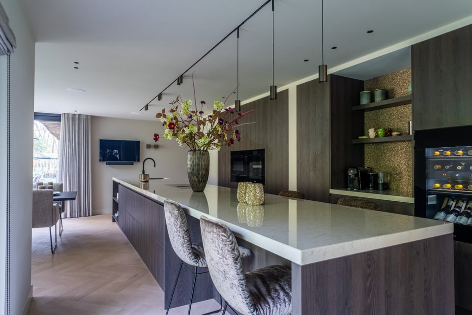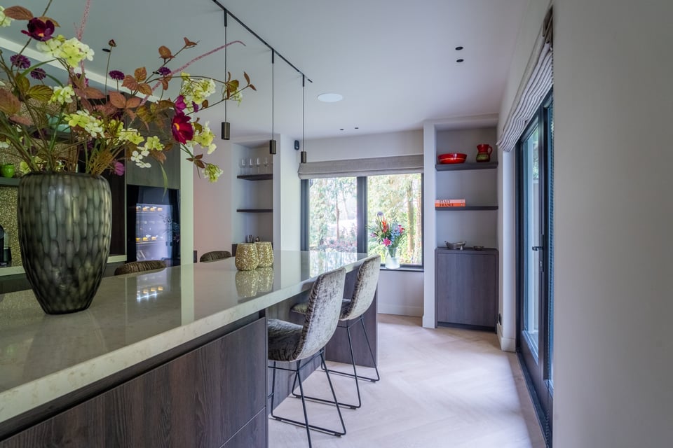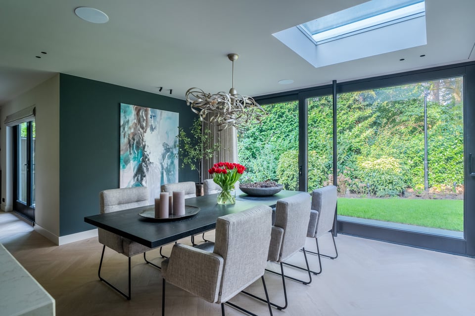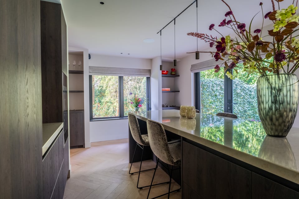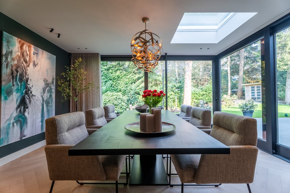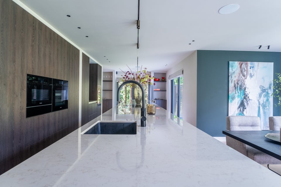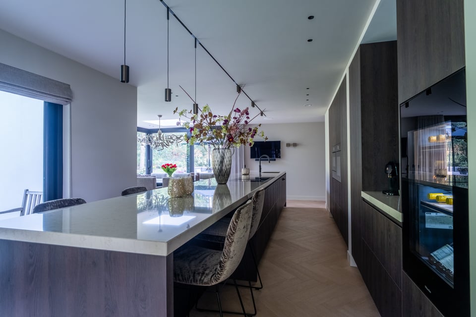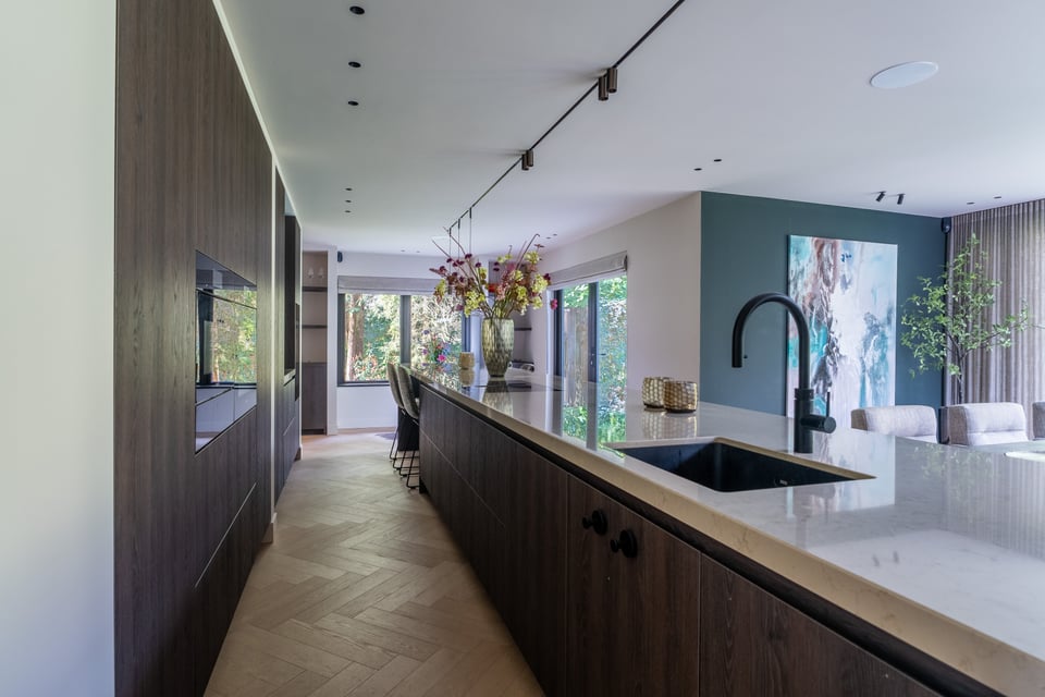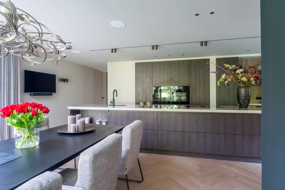 De eetkamer heeft een donkergroene muur met een groot abstract kunstwerk en een opvallende sculptuurlamp boven de tafel. Direct daarnaast de keuken: een marmeren kookeiland van zes meter, donkere houten kasten en ingebouwde Miele apparatuur. Breed, open en daglicht vanuit meerdere hoeken. Een droom om in te schieten.