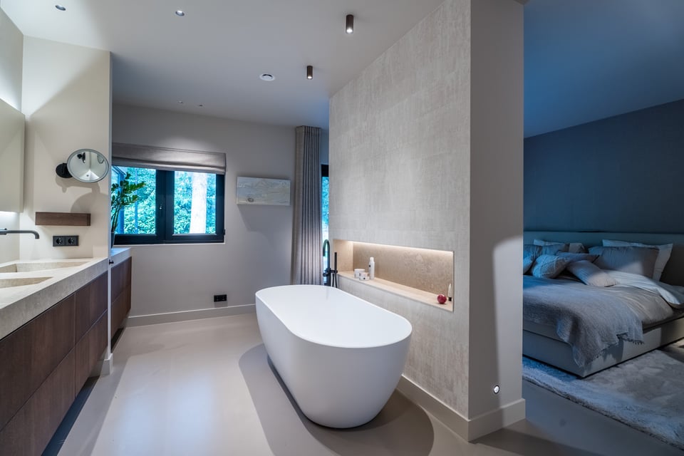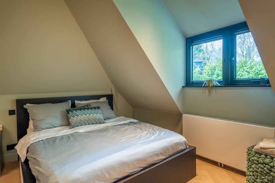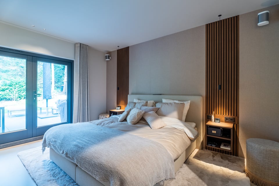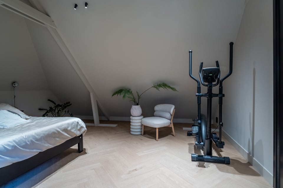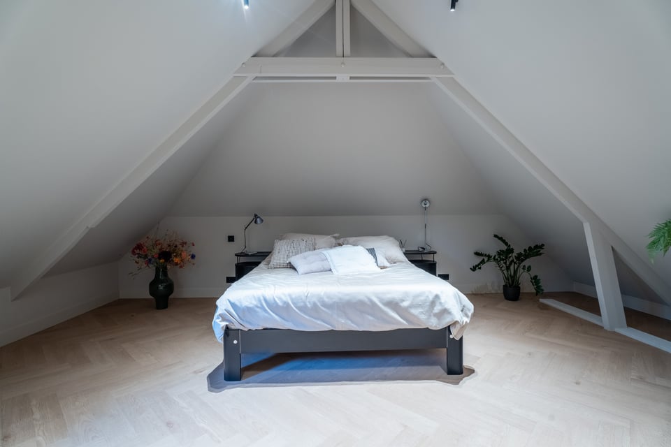 Op de begane grond is de master bedroom met directe toegang tot de tuin. Rustig, licht en stijlvol. De aangrenzende badkamer heeft een vrijstaand bad, dubbele wastafel en zwarte kranen. Op de eerste verdieping bevindt zich nog een extra slaapkamer onder het rieten dak, met schuine balken en een intiemere sfeer.