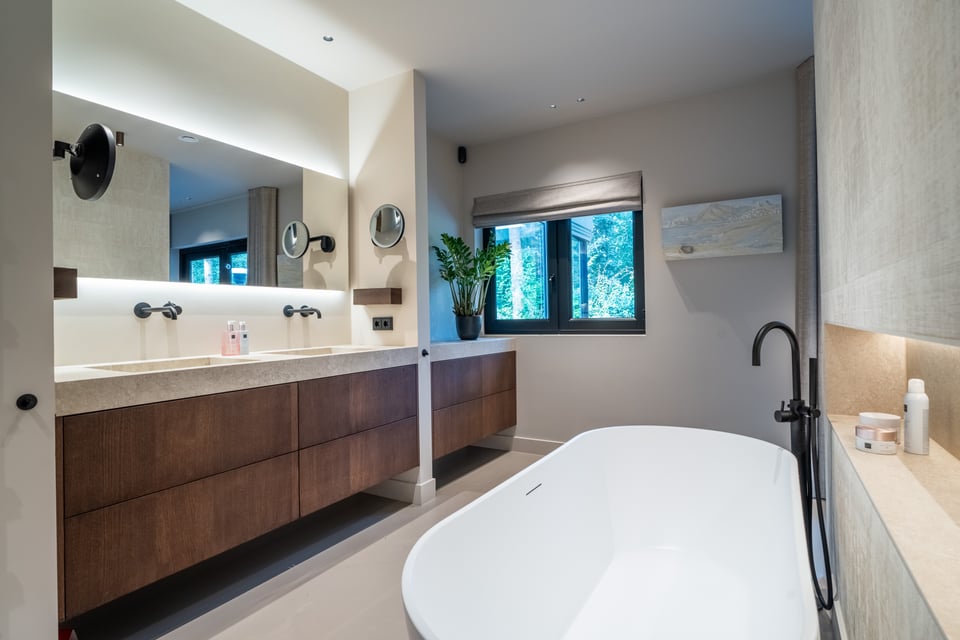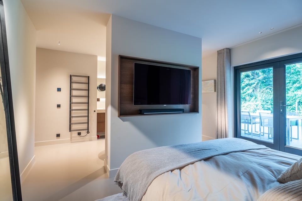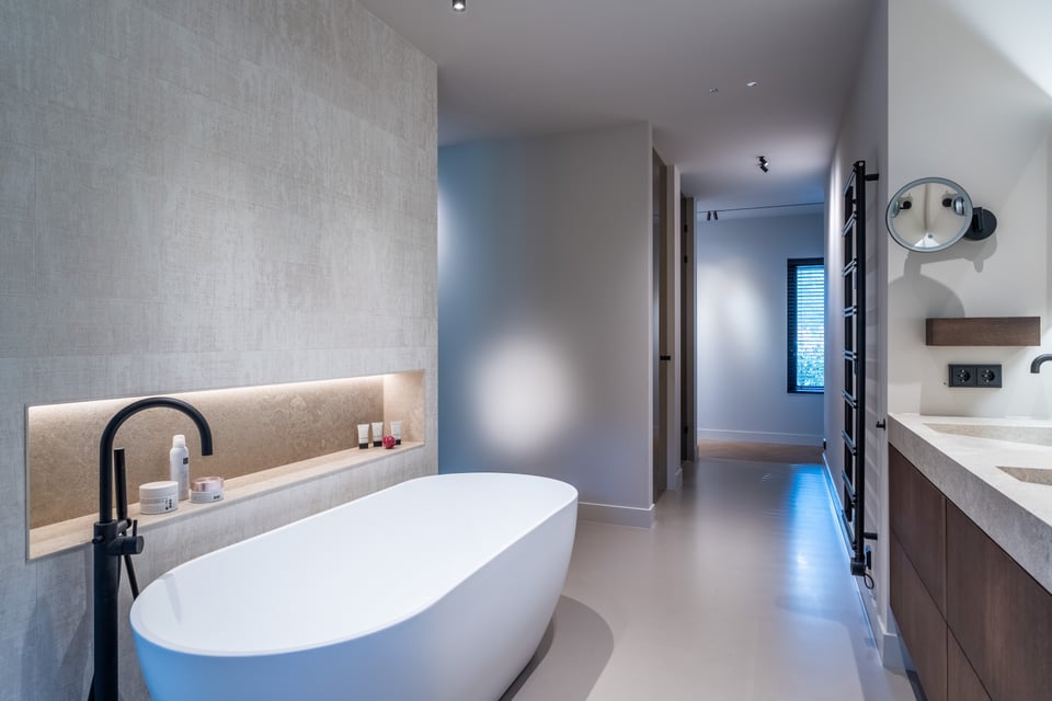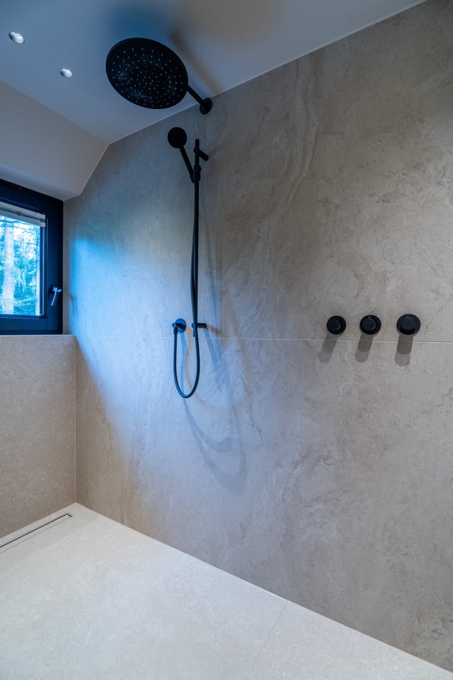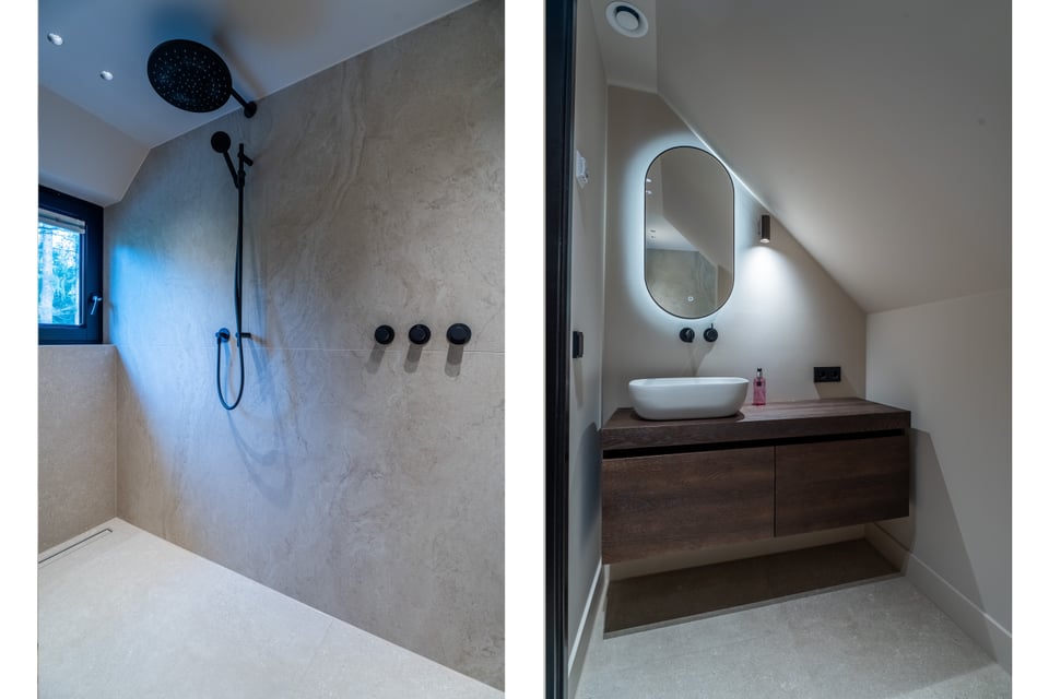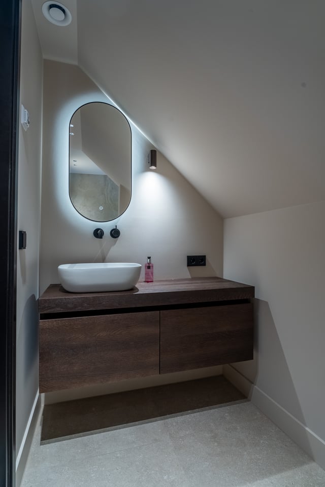Op de begane grond is de master bedroom met directe toegang tot de tuin. Rustig, licht en stijlvol. De aangrenzende badkamer heeft een vrijstaand bad, dubbele wastafel en zwarte kranen. Op de eerste verdieping bevindt zich nog een extra slaapkamer onder het rieten dak, met schuine balken en een intiemere sfeer.